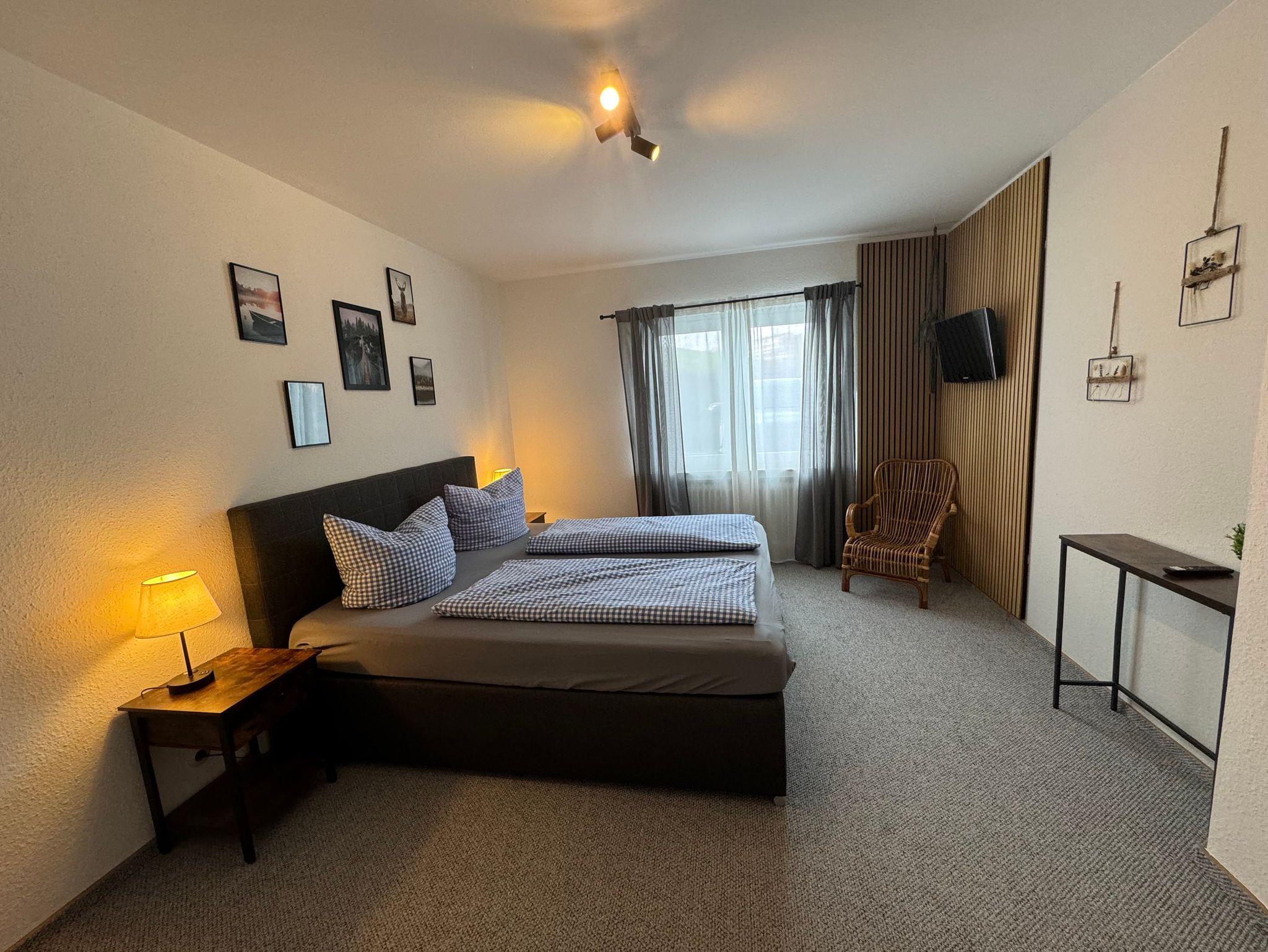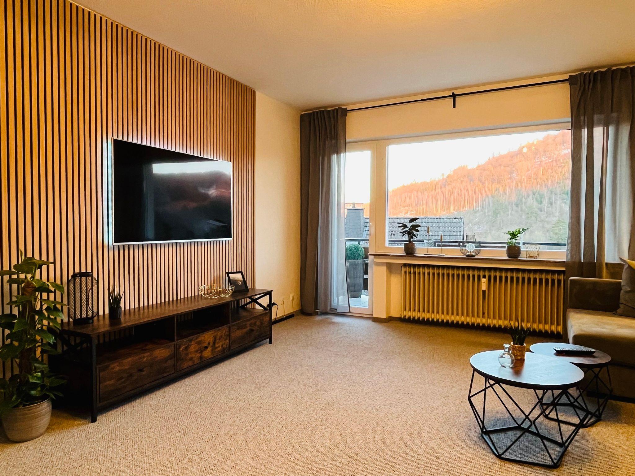 Unsere Ferienwohnung ist 66qm groß und bietet Platz für bis zu 5 Personen (max. 4 erwachsene Personen). Die Ferienwohnung liegt im Erdgeschoss und ist über 3 Stufen erreichbar. Im großzügigen Wohnzimmer mit Balkon finden Sie ein gemütliches Schlafsofa und eine Büroecke mit Schreibtisch. Der 55 Zoll Smart LED TV rundet das Angebot ab. Das separate Schlafzimmer verfügt über ein 180 x 200cm Boxspringbett mit 40 Zoll Smart LED TV. Die Küche ist voll ausgestattet und verfügt unter anderem über einen Backofen, eine Spülmaschine, eine Kaffeemaschine, einen Wasserkocher, Teller, Besteck, etc.. Wlan ist inklusive, ein Parkplatz steht ebenfalls kostenfrei zur Verfügung.