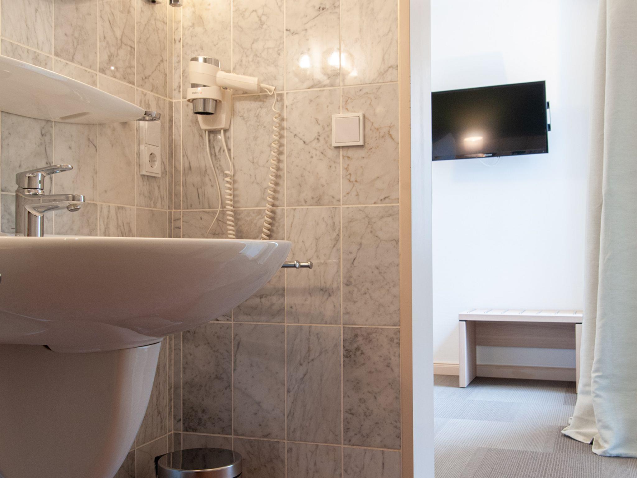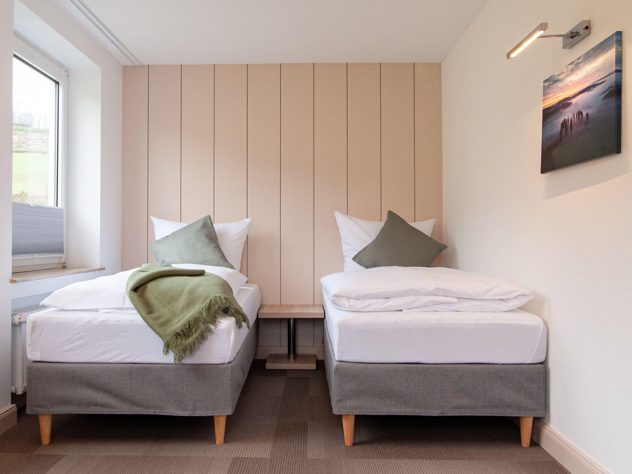 Unsere Vierbettzimmer bestehen aus einem Doppelbett und zwei Einzelbetten, in jedem Raum hängt ein Fernsehen. Zimmer Nr. 2 (ca. 27 qm) besteht aus 2 Schlafräumen und ist nur durch einen kleinen Durchgang ohne Tür getrennt. Zimmer Nr. 7 (ca. 26 qm) hat ebenfalls zwei Schlafräume, diese sind jedoch durch einen kleinen Flur voneinander getrennt und das Badezimmer liegt zwischen den beiden Räumen. Die Zimmer bieten einen Blick auf die umliegenden Wiesen und Wälder.
