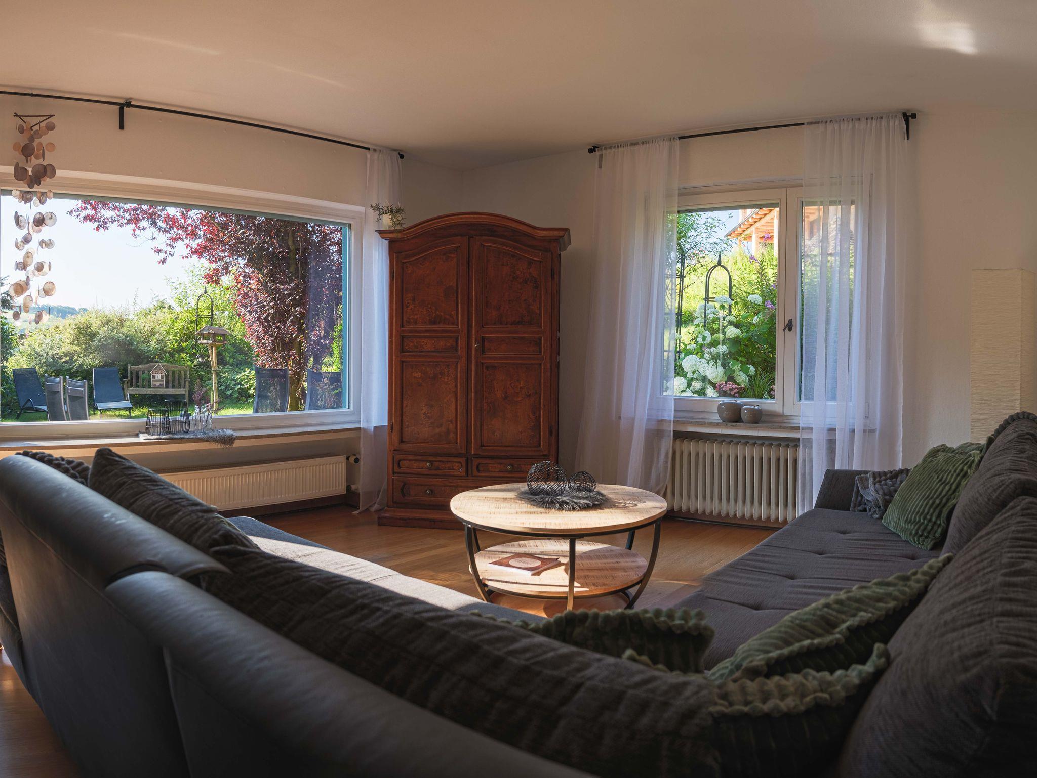 Das grosse Wohnzimmer mit Panoramafenster und Zugang zu Terrasse und Garten bietet eine großzügige Couch mit ausreichend Platz für gemütliche Fernsehabende.