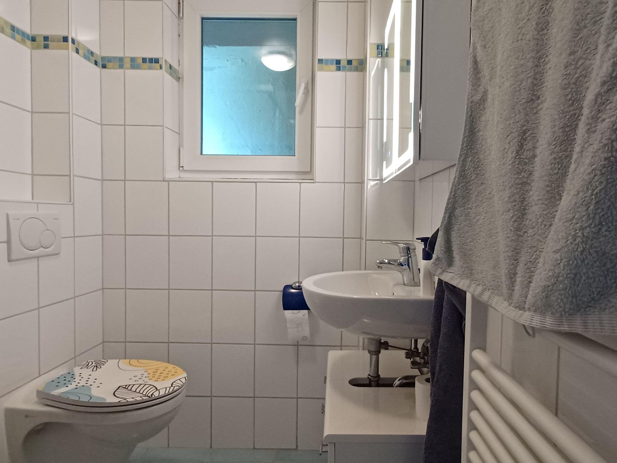 Die Wohnung bietet zwei gemütliche Zimmer mit Küchenzeile, ein kleines Bad mit Dusche sowie einen überdachten Balkon mit Zugang zum Garten. Kleine Annehmlichkeiten lassen den Aufenthalt zum Genuss werden: im Bad bringt ein beheizbarer Spiegel auch nach dem Duschen ein klares Bild. Im Schlafzimmer sorgt ein zusätzlicher Verdunkelungsvorhang für einen ruhigen Schlaf bis in den Tag hinein. Auf Wunsch gibt es ein Zustellbett für ein kleines Kind. Die Küchenzeile bietet mit Induktionskochfeld, höher gelegtem Backofen, zusätzlicher Mikrowelle und einer Kühl- Gefrierkombi für angenehmen Komfort. Und vom gemütlichen Sofa aus lässt sich das Smart-TV für die unterschiedlichsten Medien nutzen. Die teilweise offen mit Lehm verputzen Wände sorgen für eine gemütliche Atmosphäre und ein sehr gutes Raumklima. E-Bikes finden einen sicheren Raum und für das Auto gibt es einen trockenen Platz im Carport.