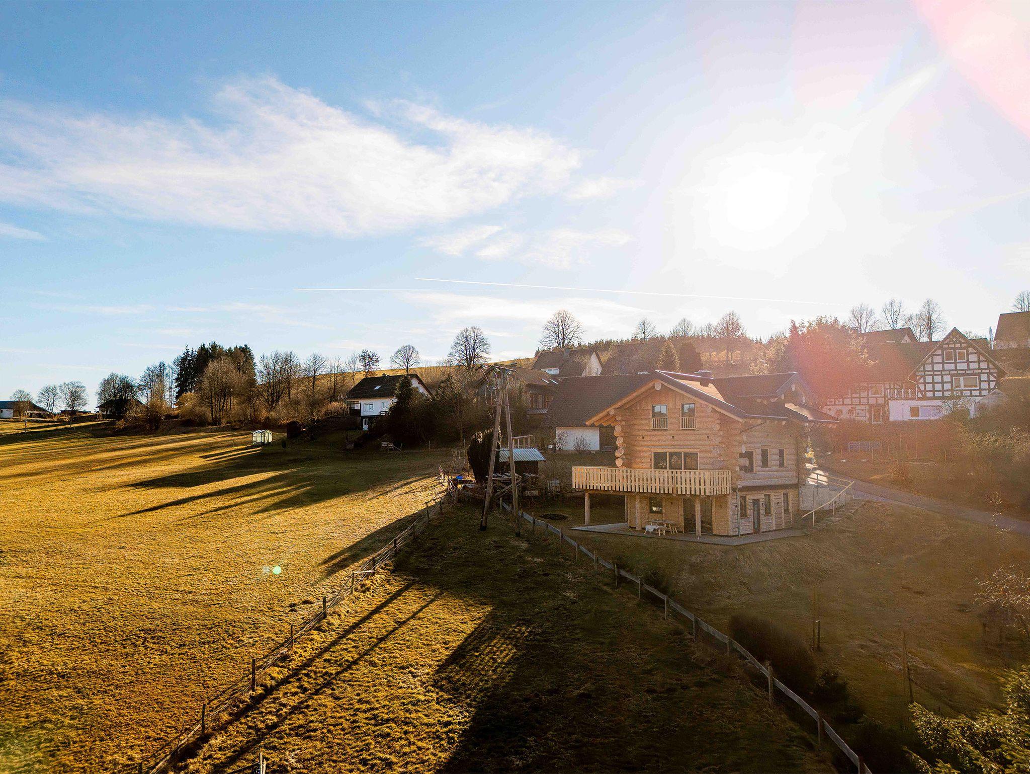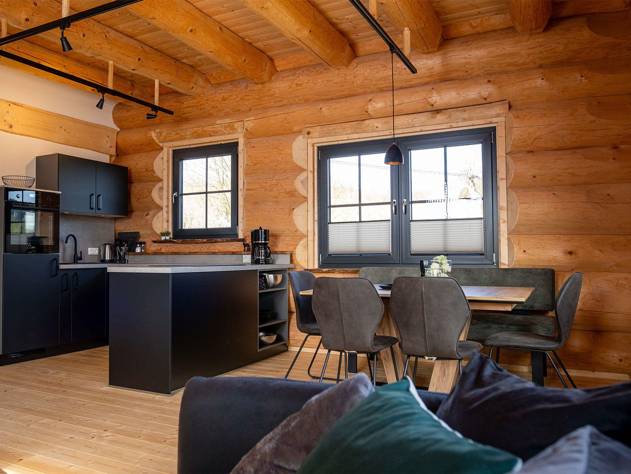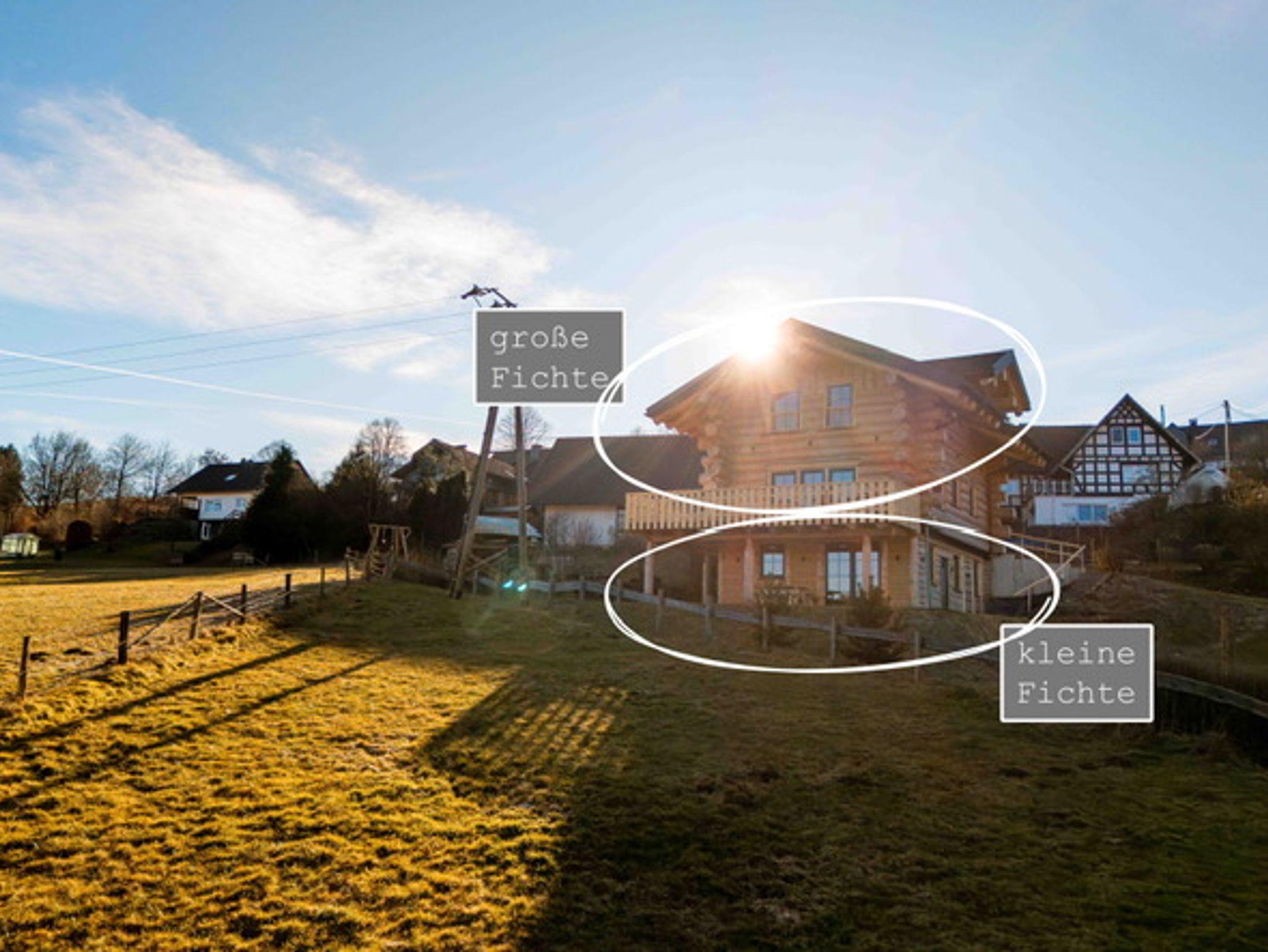Willkommen in der Großen Fichte – Ihrem gemütlichen Naturstammblockhaus mitten im Grünen! Erleben Sie unvergessliche Tage in unserer liebevoll handgefertigten Ferienunterkunft Fichtenhaus. Auf rund 85 qm erstreckt sich die Große Fichte über zwei Etagen und bietet Platz für bis zu sechs Personen. Hier vereinen sich rustikaler Charme und moderner Komfort zu einem einzigartigen Wohnerlebnis. Ihr Rückzugsort mit Wohlfühlgarantie. Bereits beim Betreten des Erdgeschosses empfängt Sie ein großzügiger, offener Wohnbereich. Die voll ausgestattete Küche mit Kühl-Gefrierkombination, Backofen, Geschirrspüler, Toaster, Wasserkocher, Kaffeemaschine und Induktionskochfeld lässt keine Wünsche offen. Ob ausgedehnte Frühstücke oder gemeinsame Kochabende – der gemütliche Essbereich lädt zum Verweilen ein. Direkt angrenzend befindet sich der behagliche Wohnbereich mit einer großen, ausziehbaren Couch und TV. Hier können Sie entspannte Stunden mit Ihren Liebsten verbringen. Ein separates WC im Eingangsbereich sorgt für zusätzlichen Komfort.Panoramablick & Natur pur ! Vom Wohnbereich aus gelangen Sie auf den umlaufenden Balkon – ein wahres Highlight der Unterkunft. Genießen Sie von hier aus den atemberaubenden Blick über das Tal und die dichten Wälder der Gemeinde Wingeshausen. Ob beim Frühstück in der Morgensonne oder bei einem Glas Wein am Abend – dieser Ort lädt zum Träumen ein. Über die handgefertigte Holztreppe erreichen Sie das Obergeschoss mit drei gemütlichen Doppelschlafzimmern. Hier erwarten Sie zwei Betten mit 160 cm Breite und ein großzügiges Bett mit 180 cm Breite – alle ausgestattet mit hochwertigen Einzelmatratzen für optimalen Schlafkomfort in natürlicher Atmosphäre. Auf Wunsch stellen wir Ihnen gerne ein Babybett und einen Hochstuhl zur Verfügung. Ein charmantes Duschbad sorgt für einen erfrischenden Start in den Tag. Und für die Abenteuerlustigen: Die offene Galerie begeistert mit einem angebrachten Fischernetz – perfekt zum Klettern, Entspannen oder einfach zum Genießen des traumhaften Ausblicks auf die Natur.