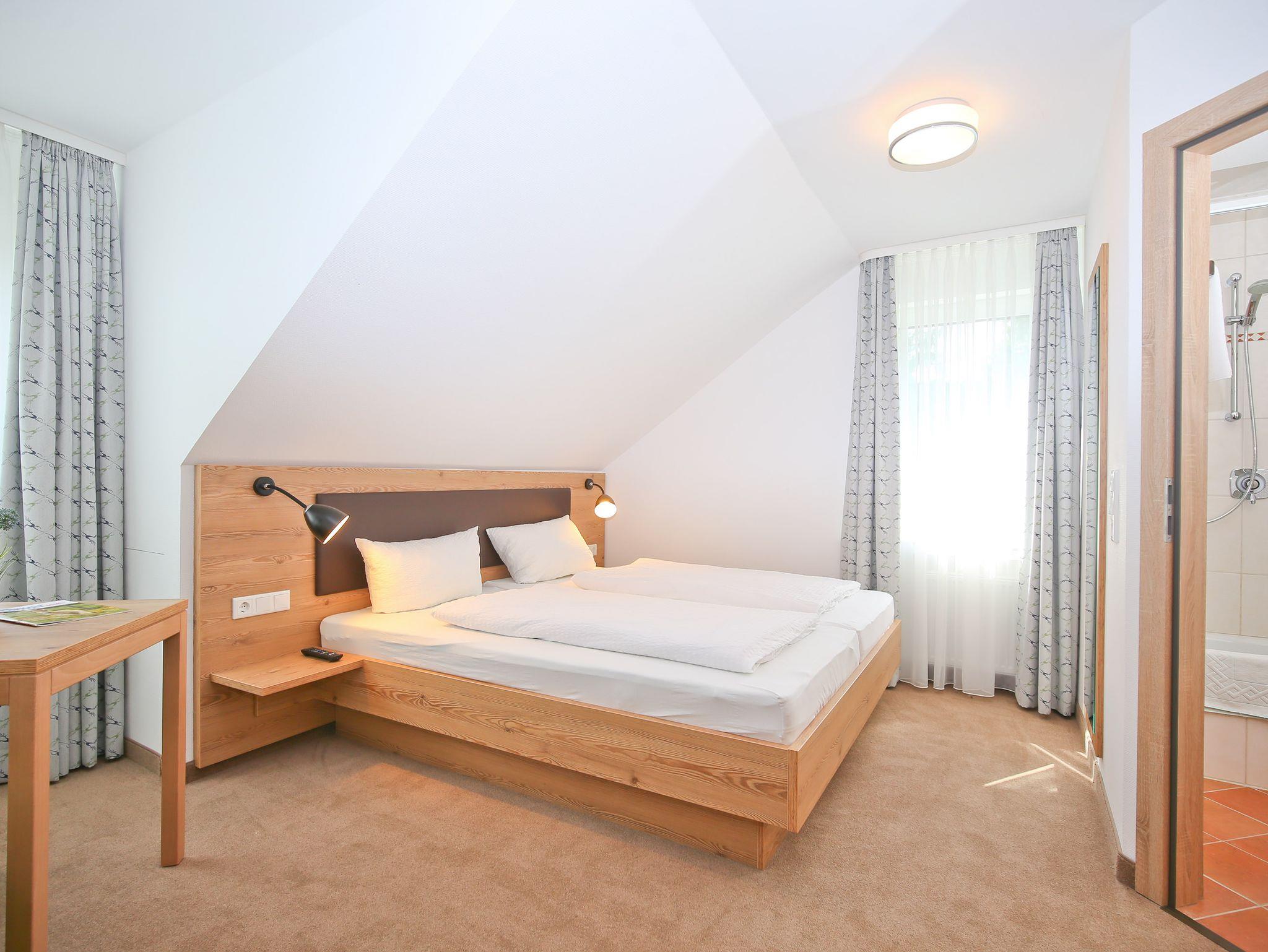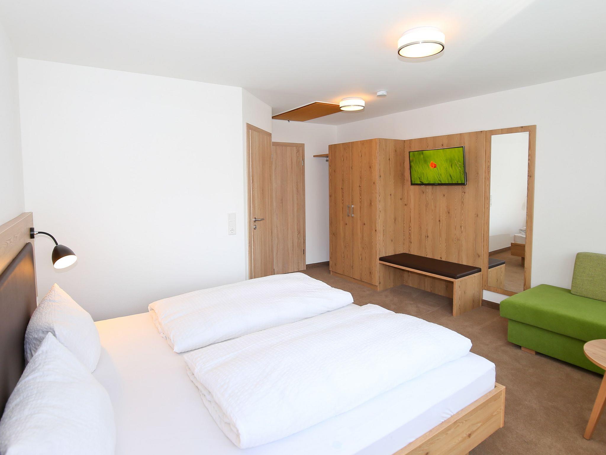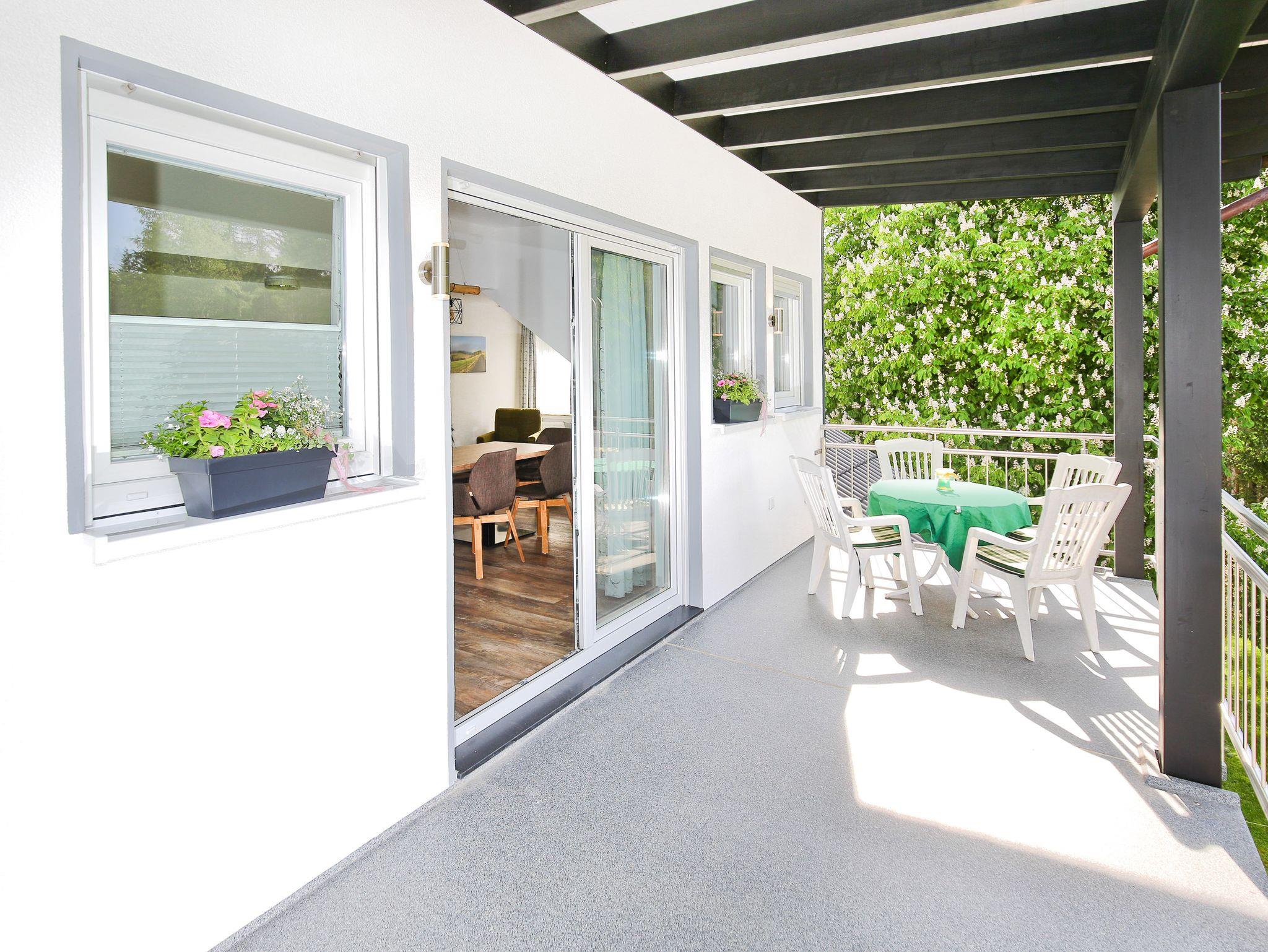 Und wenn euch doch der Sinn nach Sonne, Landluft und Berglandschaft steht, dann ist der Außenbereich nur eine Türöffnung entfernt. Denn direkt an den großen Aufenthaltsraum grenzt ein langgezogener 20-Quadratmeter-Balkon mit Blick auf die Scheune und den Innenhof unseres Gasthofes. Auch hier wartet eine große, gemütliche Sitzgruppe auf euch.