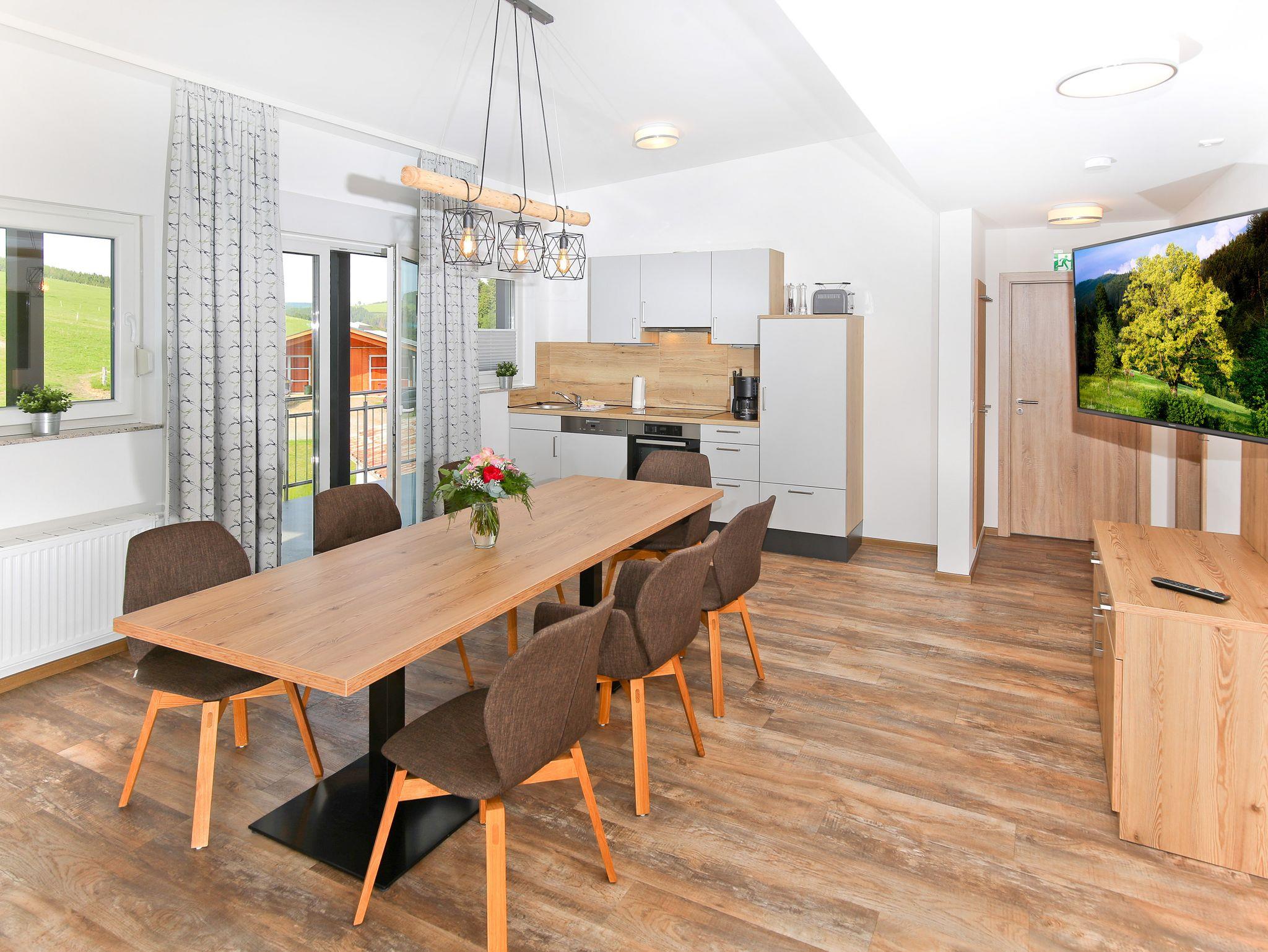 Der geräumige Wohn- und Essbereich ist wie geschaffen für spaßige Brett- und Kartenspielrunden und ist durch die Kombination aus Holzoptik und Moderne der Hingucker schlechthin in der Ferienwohnung. Auch die interessante Dachschräge verleiht dem Raum einen besonderen Charme.