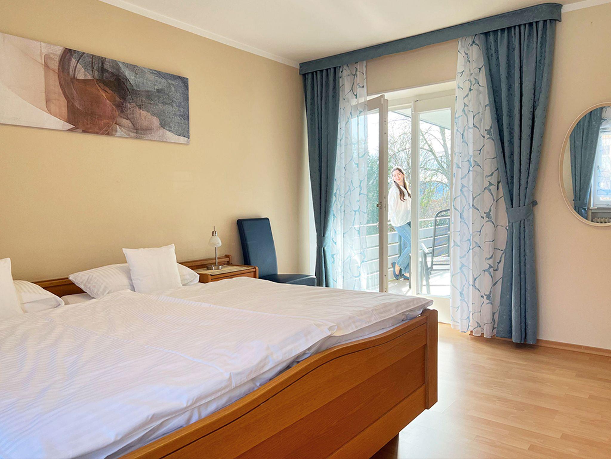 großes Schlafzimmer mit Außenrolladen, Balkontüre, Bettwäsche.