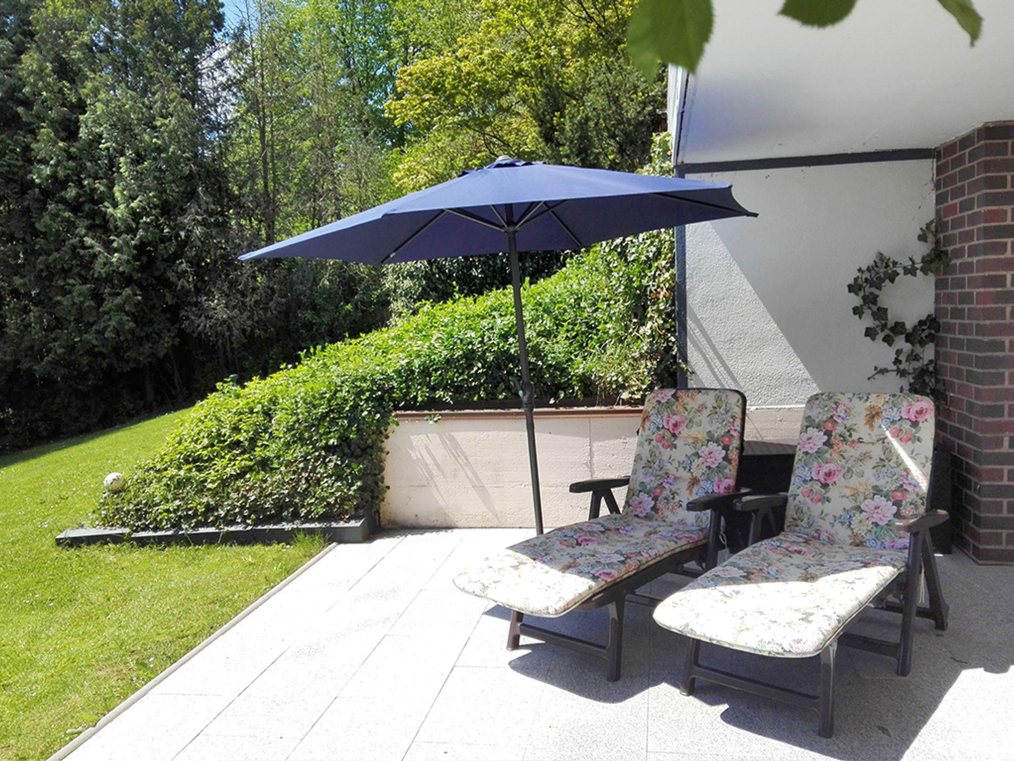 große Sonnen-Terrasse zur Südseite mit Blick in den Garten, Liegestühlen, Gartentisch/Stühle