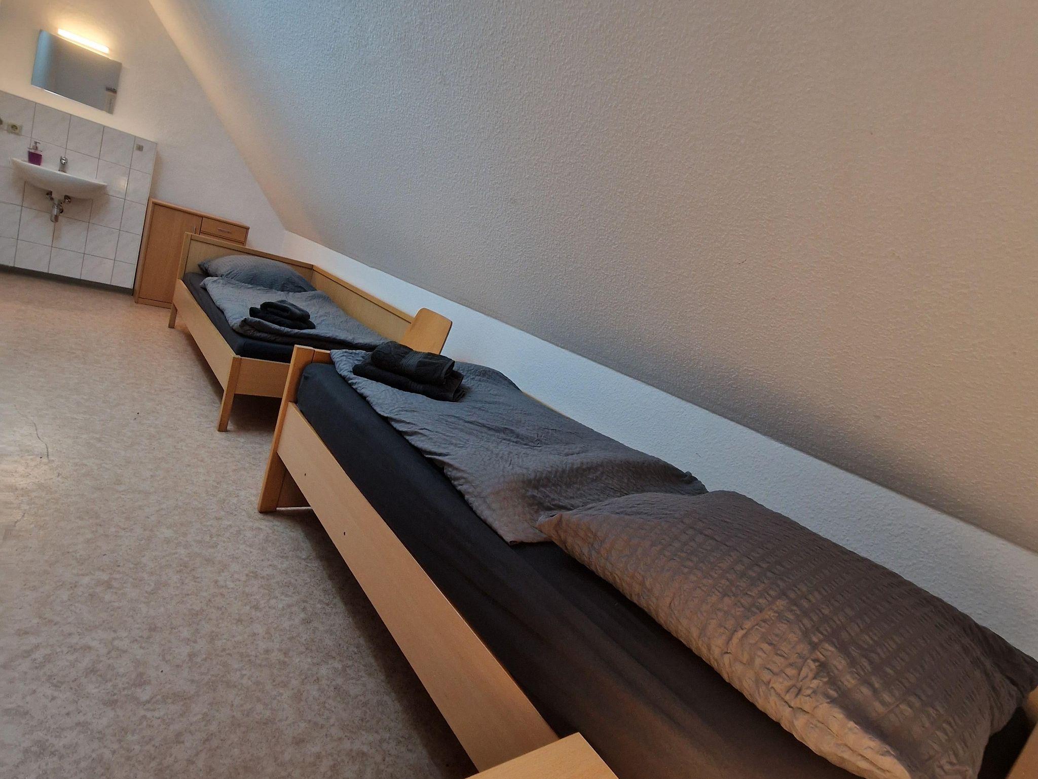 Dieses Zimmer hat einen eigenen Wohnbereich mit gemütlicher TV Ecke und Schlafsofa. Links und rechts sind die Schlafzimmer mit je 2 Einzelbetten, Nachttisch, Lampe, Stuhl und eigenem Waschbecken mit Spiegel. Zu diesem Zimmer gehören unsere Gemeinschaftstoiletten und Duschen vor dem Zimmer.