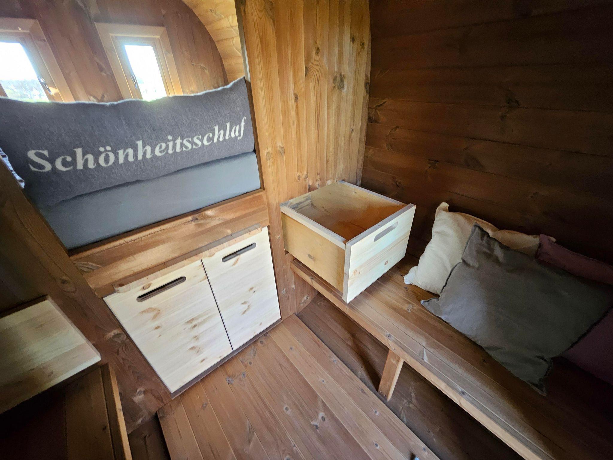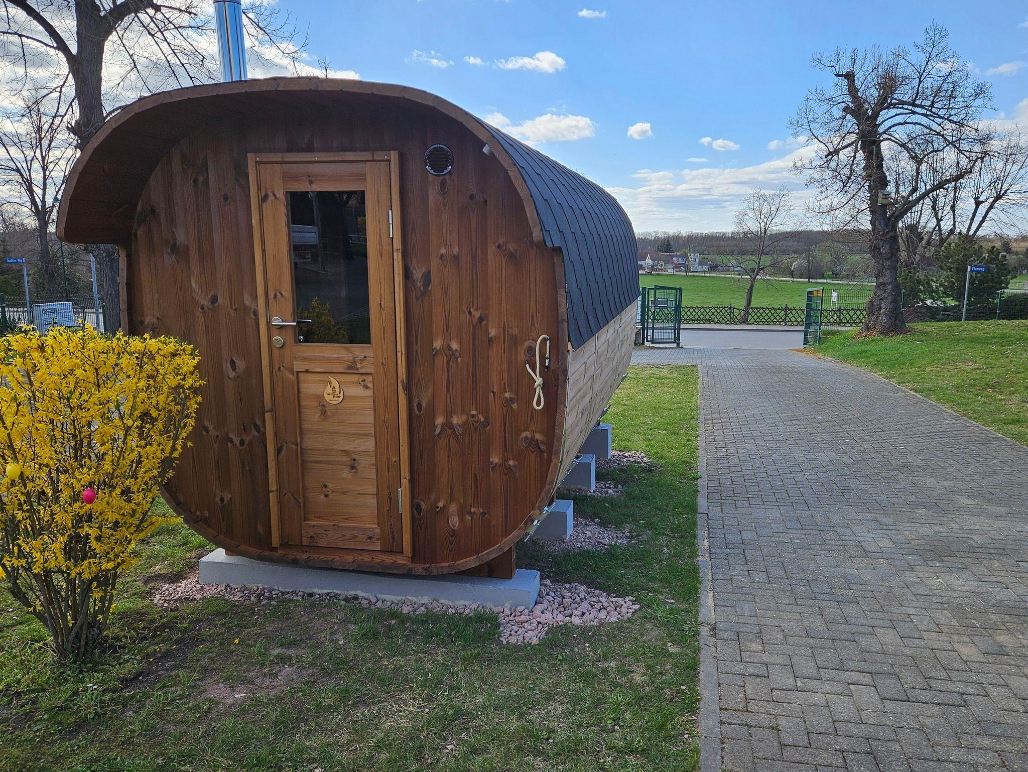 Vor dem Fass findet Ihr eine Sitzgruppe für gemütliche Stunden mit netten Menschen.