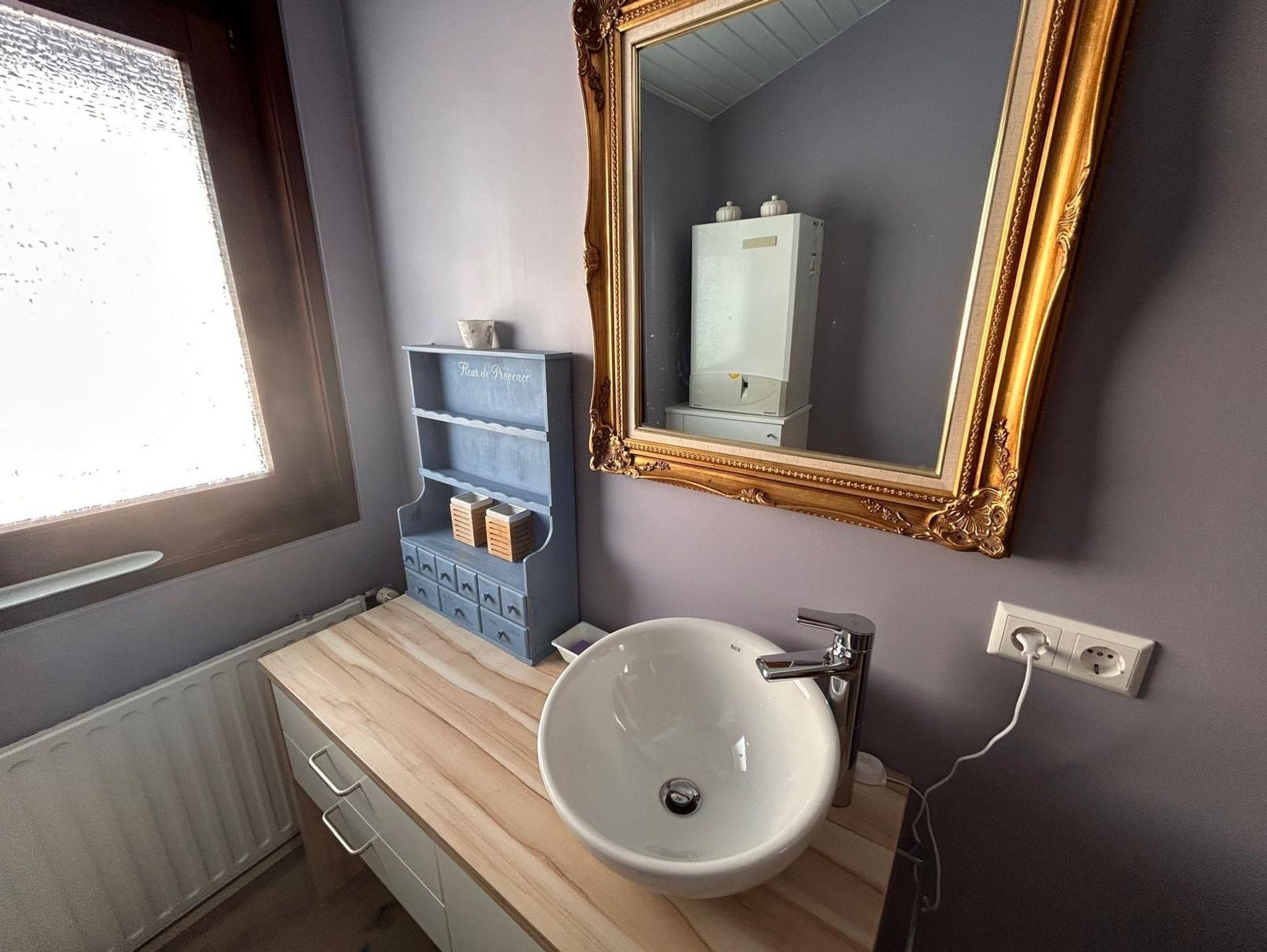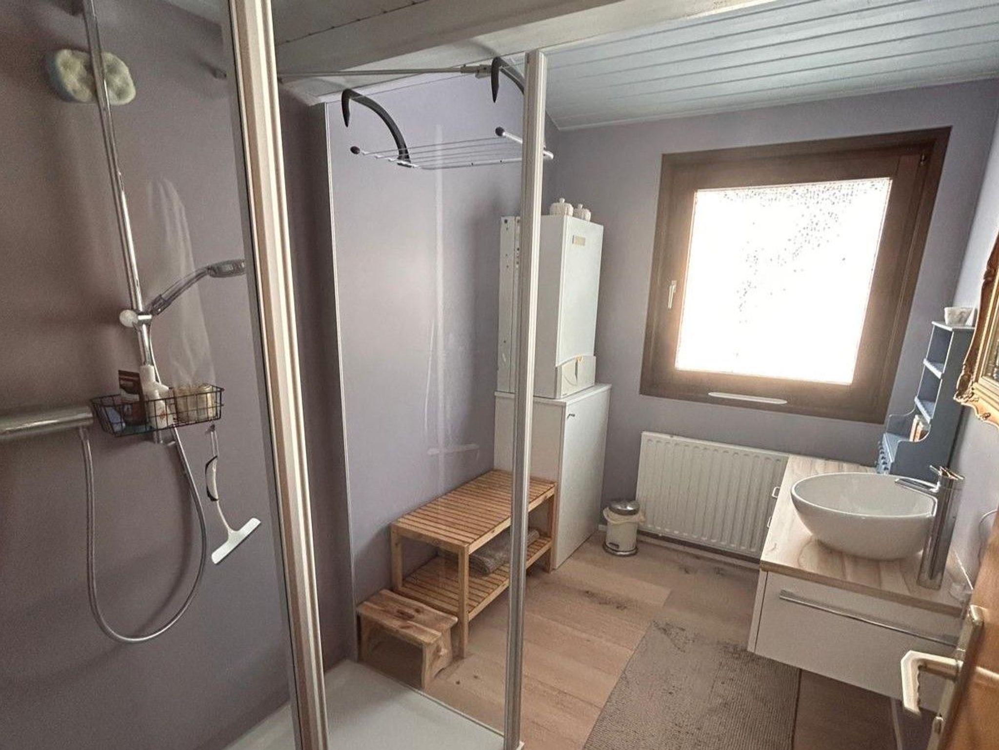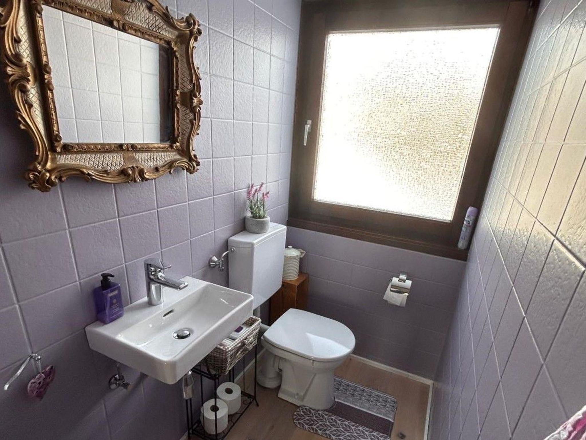 Badezimmer mit Dusche/WC und Waschbecken und ein separates WC. Ein Abstellraum ist vorhanden.