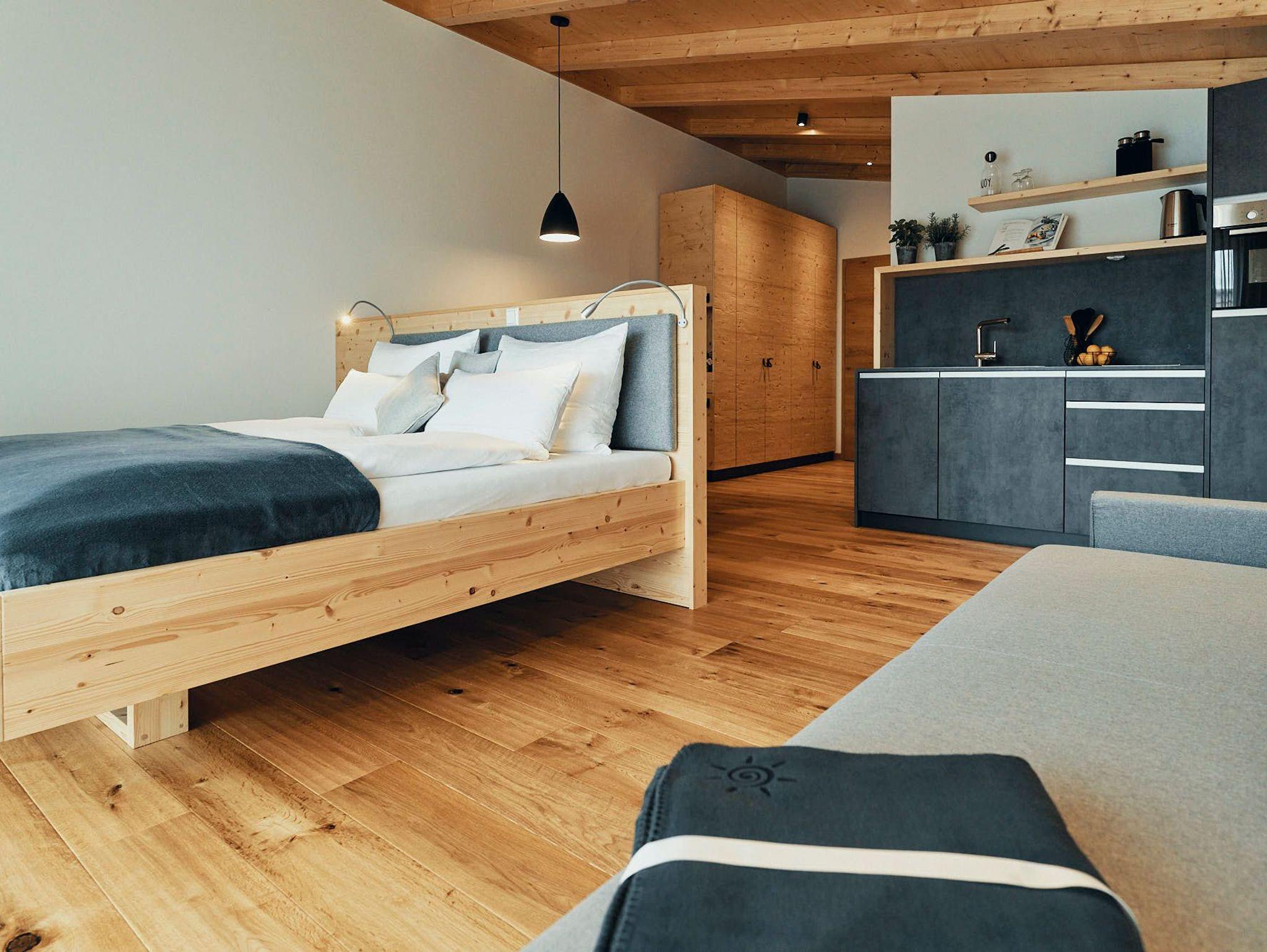 Acht einzigartige Apartments lichtdurchflutet und mit Platz für bis zu sechs Personen. Raumhohe Fenster lassen die Natur herein, während heimische Fichtenholzdecken eine Atmosphäre der Geborgenheit schaffen. Wohnen und Schlafen sind nur durch transparente Elemente getrennt, was den loftartigen Charakter der Räume unterstreicht.