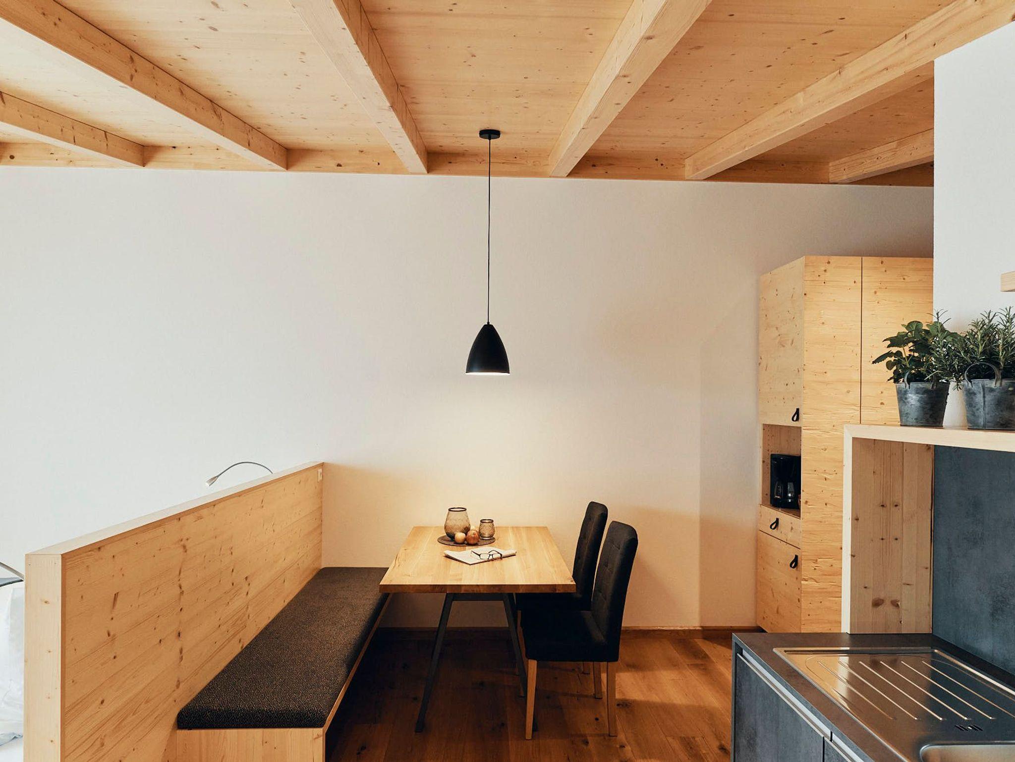 Das Ruhe.Puls Apartment bietet auf 37 m² Wohnfläche und einer 10 m² großen Terrasse Platz für bis zu 4 Personen. Es befindet sich im Erdgeschoss und überzeugt durch die Verwendung von Zirbenholz, das für seine beruhigenden und gesundheitsfördernden Eigenschaften bekannt ist. Das Apartment umfasst ein Doppelbett (180 x 200 cm) und eine Schlafcouch (145 x 200 cm) sowie ein modernes Badezimmer mit Regendusche. Die Räume sind rollstuhlgerecht gestaltet und ermöglichen eine barrierefreie Nutzung. Die ruhige Lage und das natürliche Design machen es zu einem idealen Ort für Erholung und Entspannung.