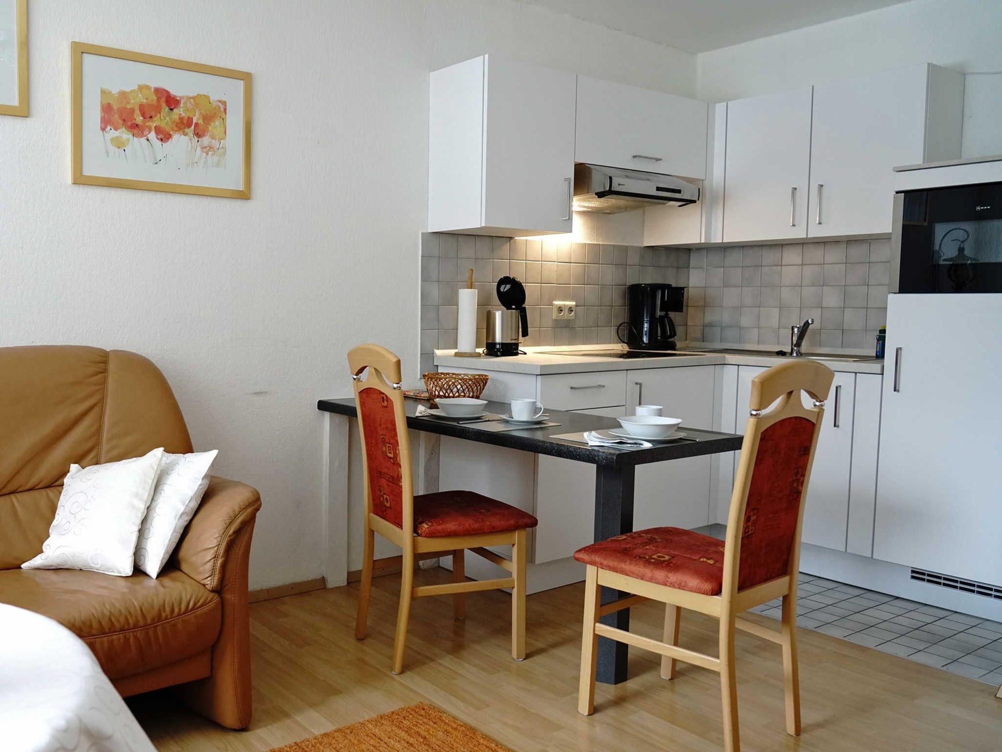 Die Nichtraucher Ferienwohnung Nr.1 ist ca. 56qm gross und hat eine vollständige eingerichtete Küche. Im gemütlichen Wohnbereich mit integriertem Essplatz lässt sich die Zeit angenehm verbringen. Das Schlafzimmer mit Doppelbett ist sehr ruhig gelegen ohne Strassenlärm.