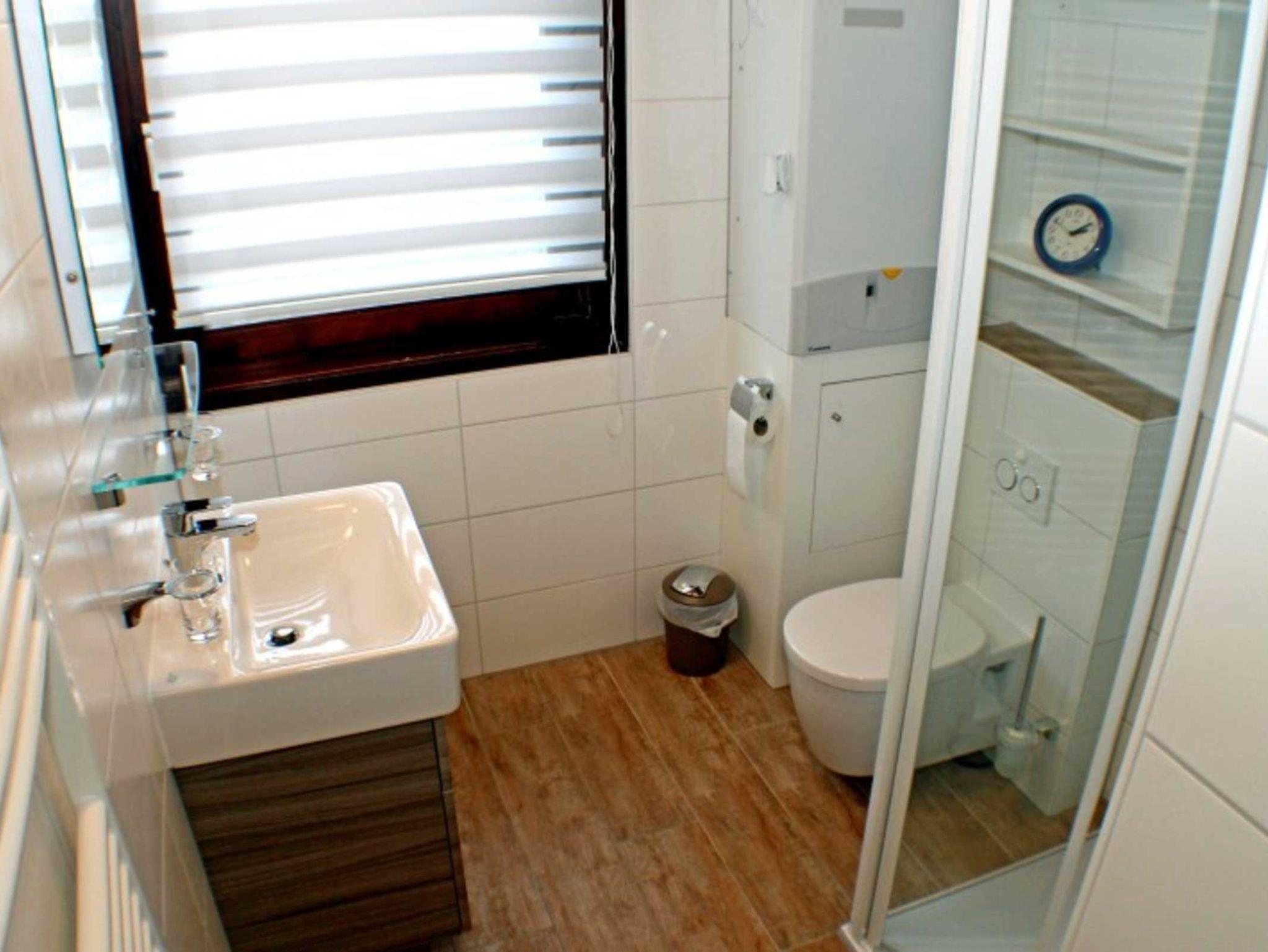 Dusche/WC, genügend Ablagemöglichkeiten, Badezimmerhocker, Reisefön und Verbandskasten.