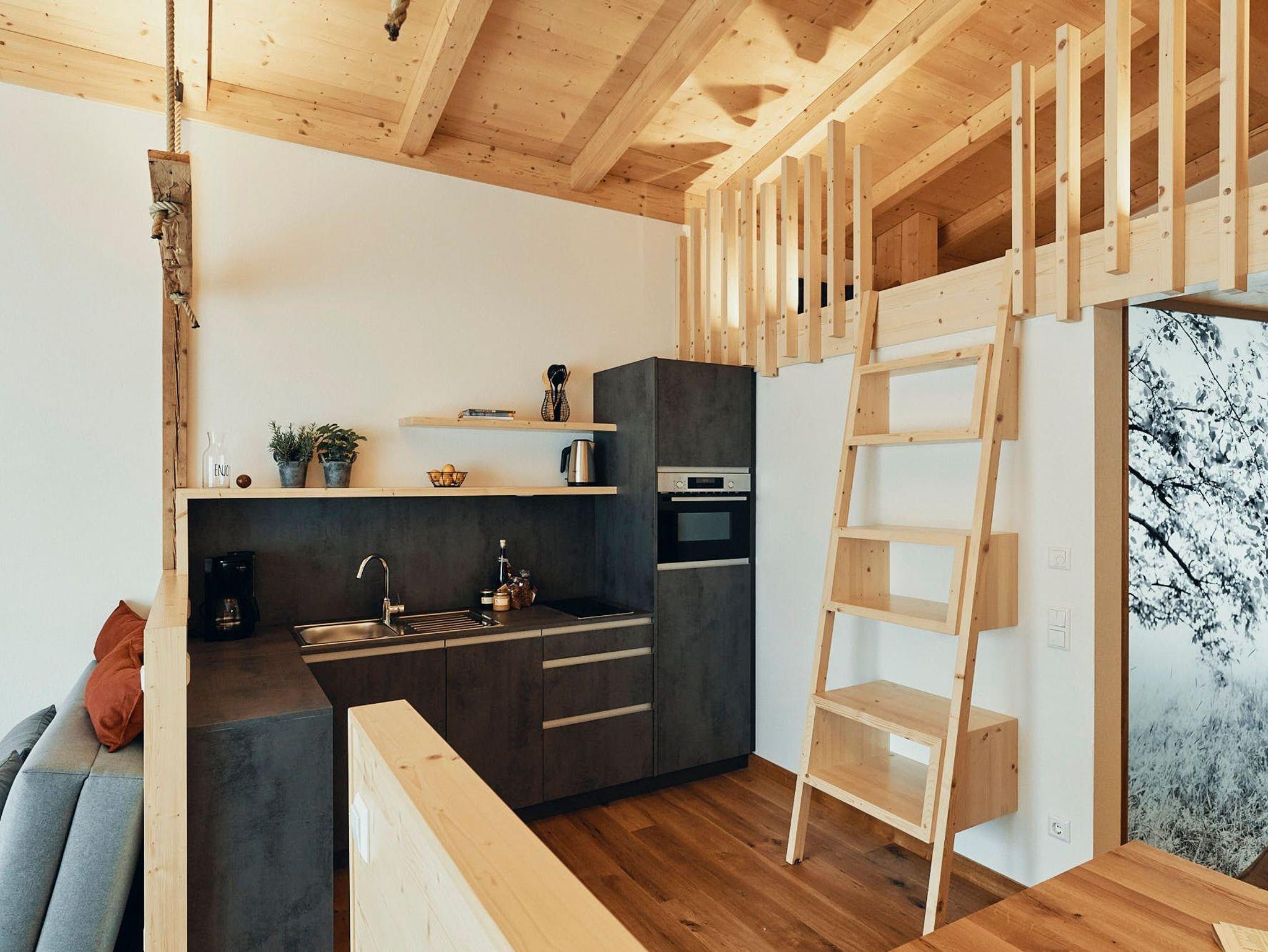 Fließende Übergänge verleihen Leichtigkeit, während handgefertigte Möbel aus der Tischlerwerkstatt individuelle Akzente setzen. Der gehobelte Eichenholzboden natürlich naturgeölt sorgt für eine spürbare Erdung und angenehme Wärme. Die kompakte, aber voll ausgestattete Küche macht Selbstversorgung zum Vergnügen. Eine ausziehbare Schlafcouch bietet zusätzlichen Raum für Gäste oder Tagträumer.