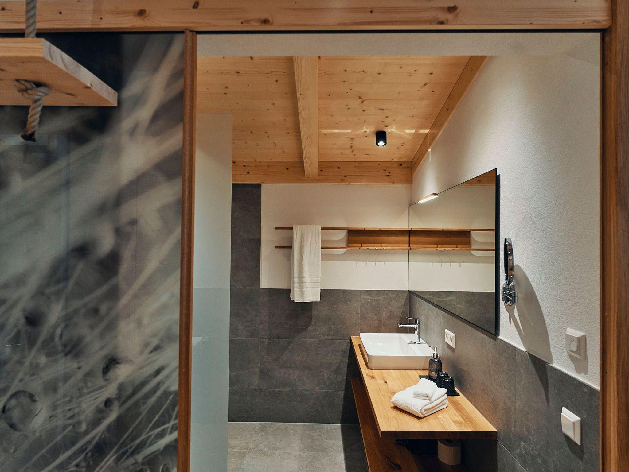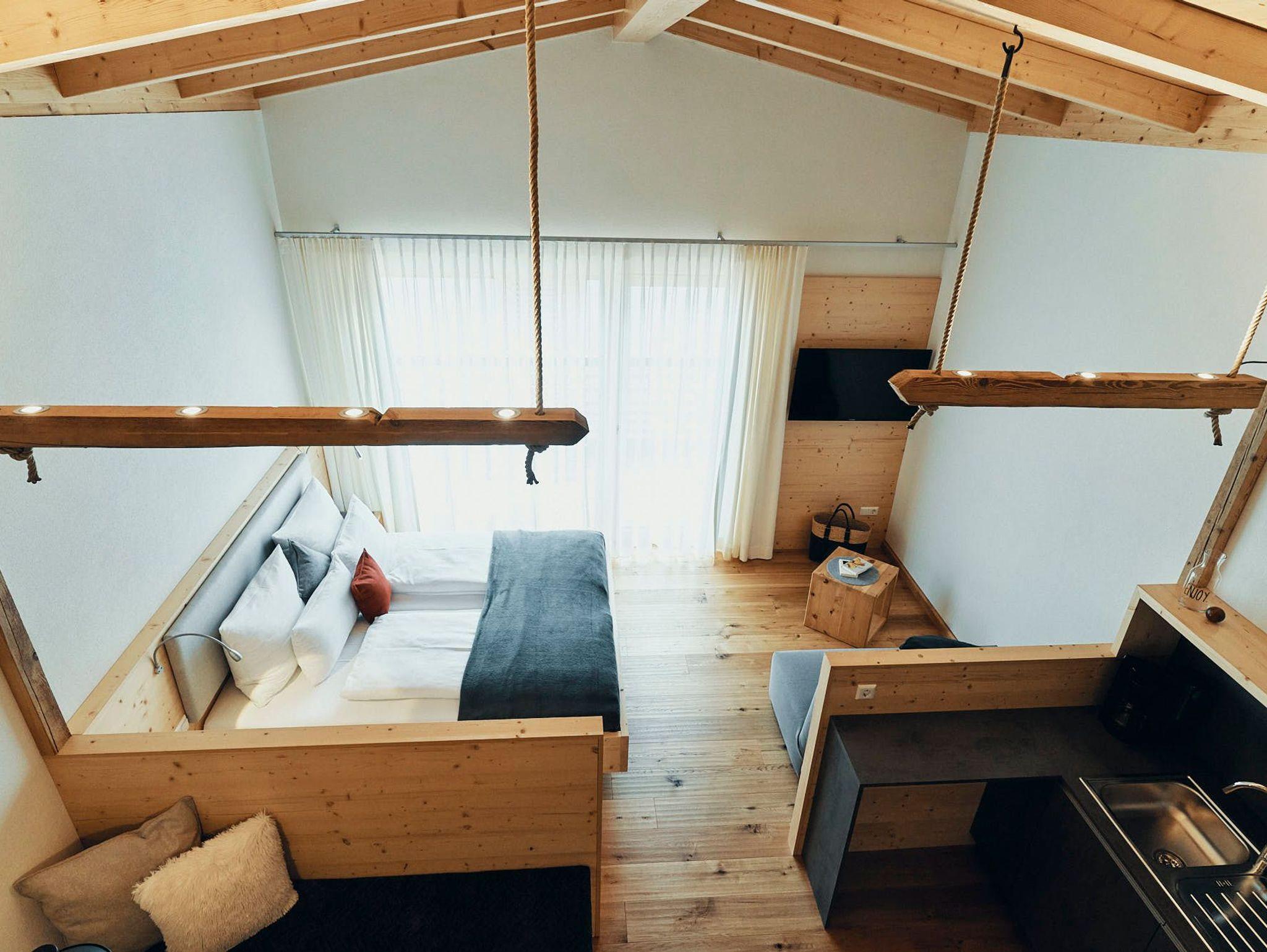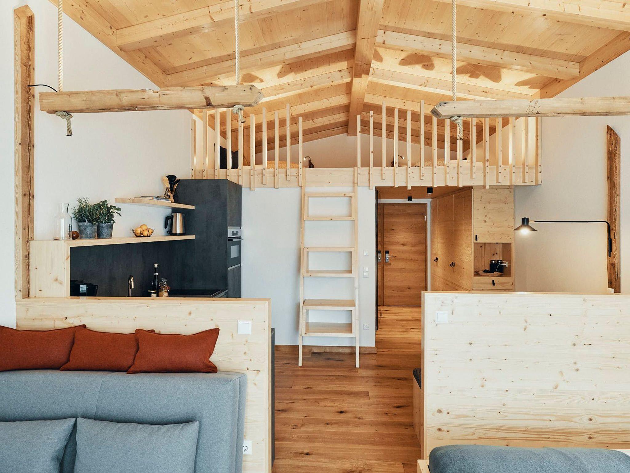 Acht einzigartige Apartments lichtdurchflutet und mit Platz für bis zu sechs Personen. Raumhohe Fenster lassen die Natur herein, während heimische Fichtenholzdecken eine Atmosphäre der Geborgenheit schaffen. Wohnen und Schlafen sind nur durch transparente Elemente getrennt, was den loftartigen Charakter der Räume unterstreicht.