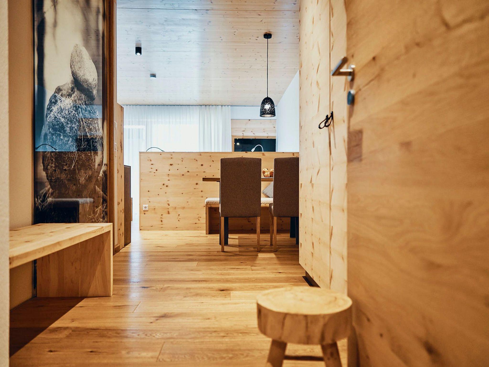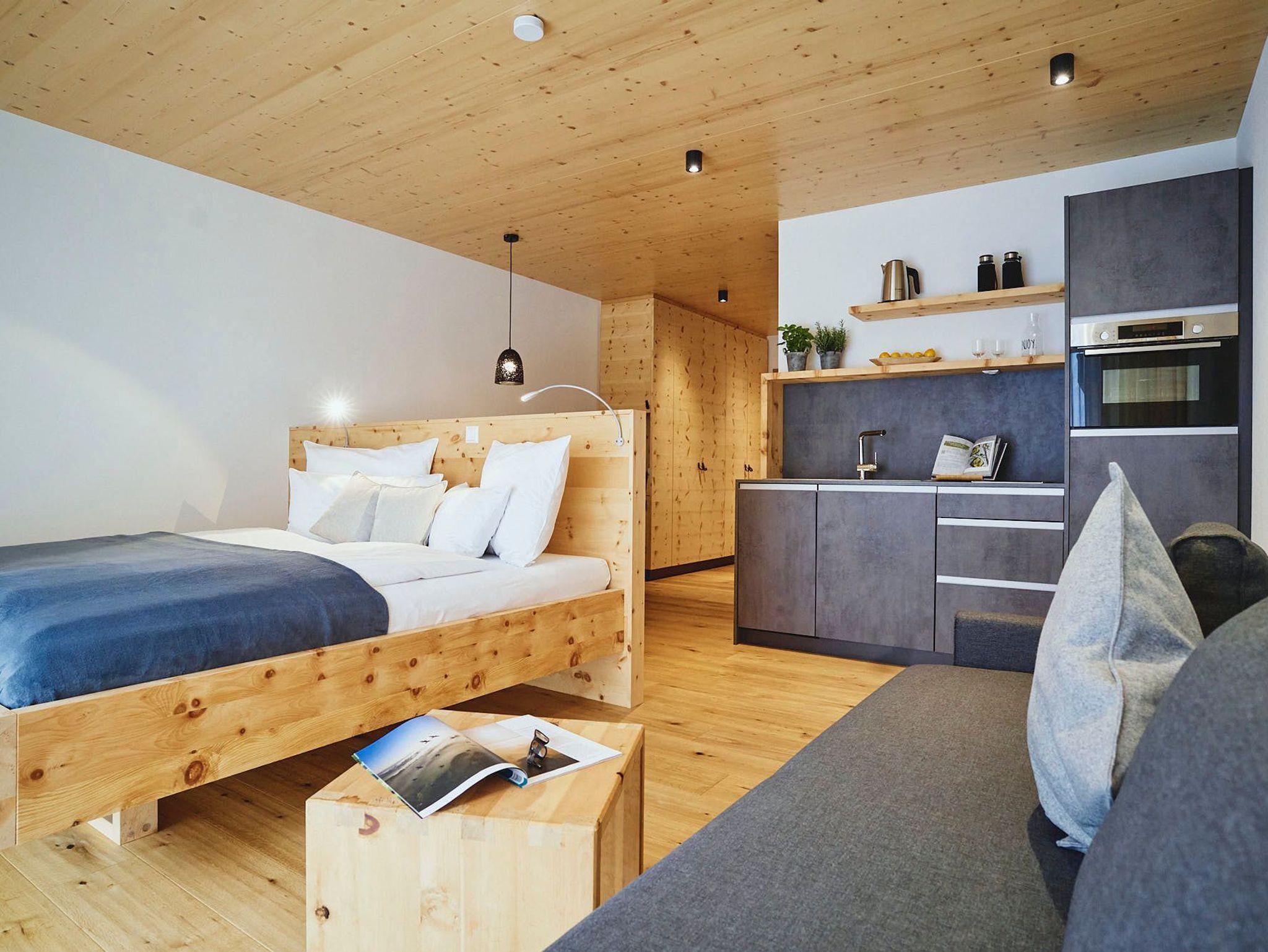 Acht einzigartige Apartments lichtdurchflutet und mit Platz für bis zu sechs Personen. Raumhohe Fenster lassen die Natur herein, während heimische Fichtenholzdecken eine Atmosphäre der Geborgenheit schaffen. Wohnen und Schlafen sind nur durch transparente Elemente getrennt, was den loftartigen Charakter der Räume unterstreicht.