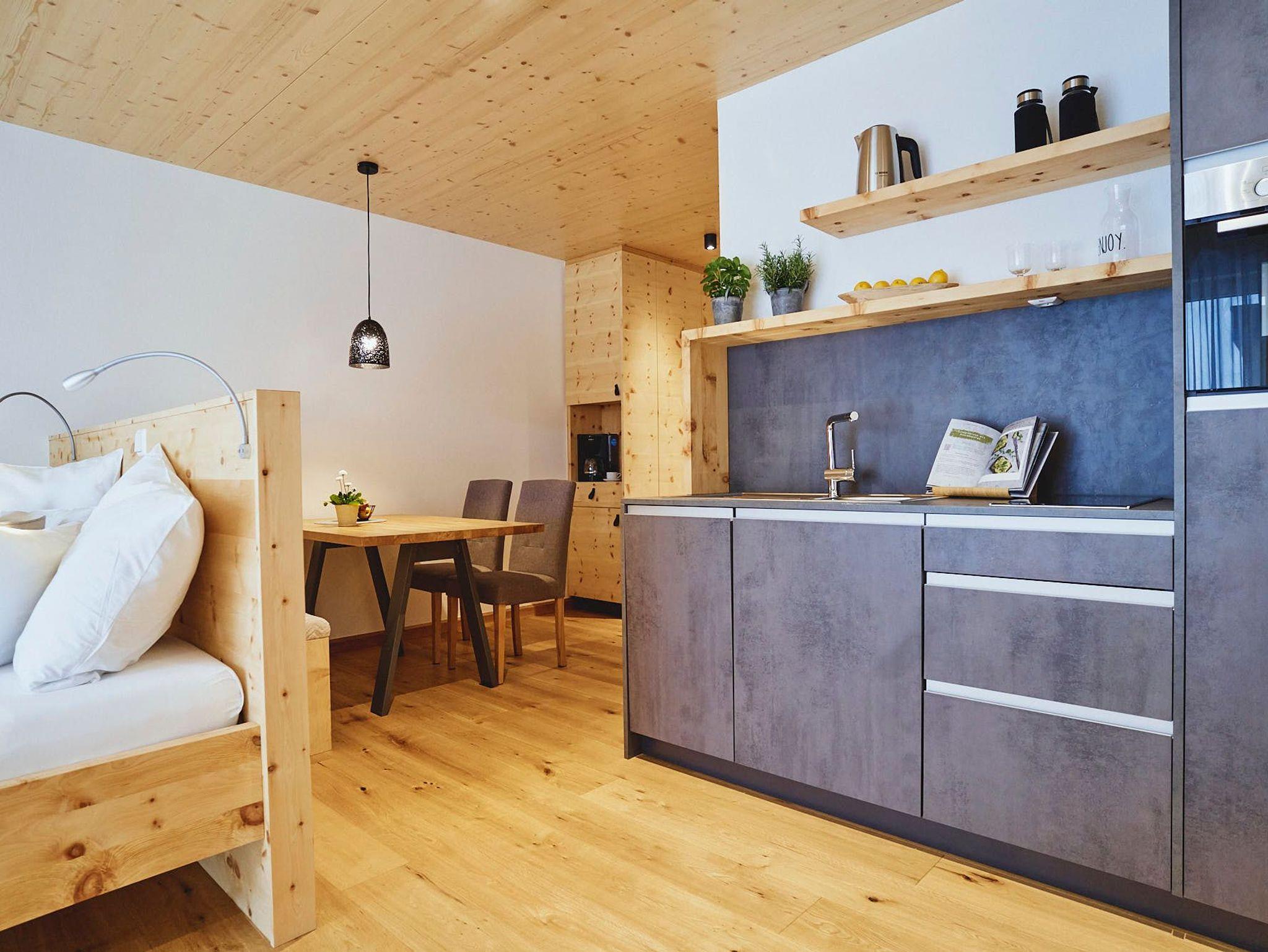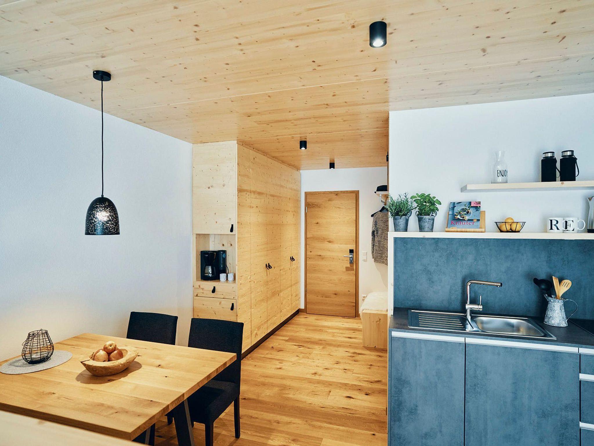 Fließende Übergänge verleihen Leichtigkeit, während handgefertigte Möbel aus der Tischlerwerkstatt individuelle Akzente setzen. Der gehobelte Eichenholzboden natürlich naturgeölt sorgt für eine spürbare Erdung und angenehme Wärme. Die kompakte, aber voll ausgestattete Küche macht Selbstversorgung zum Vergnügen. Eine ausziehbare Schlafcouch bietet zusätzlichen Raum für Gäste oder Tagträumer.