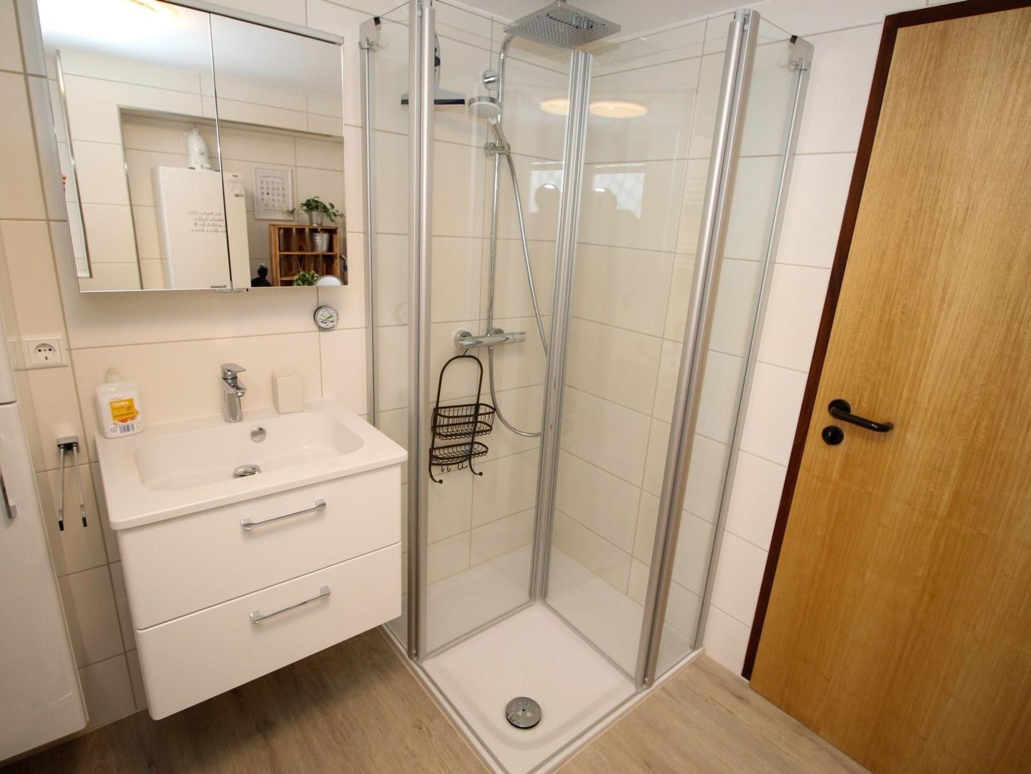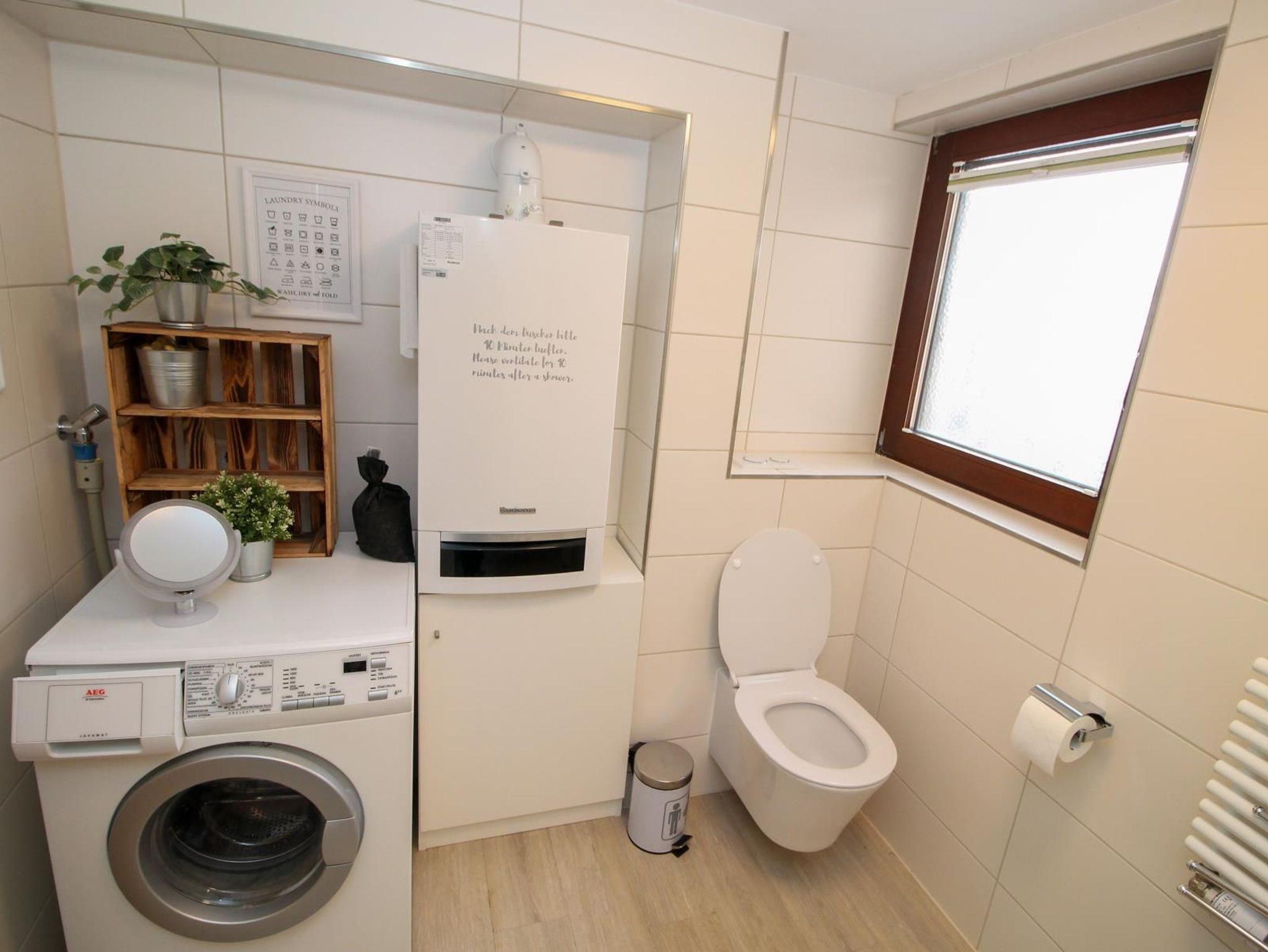 Bad mit viel Stauraum mit Toilette und Duschkabine, Waschmaschine, Bügeleisen, Bügelbrett und Haartrockner