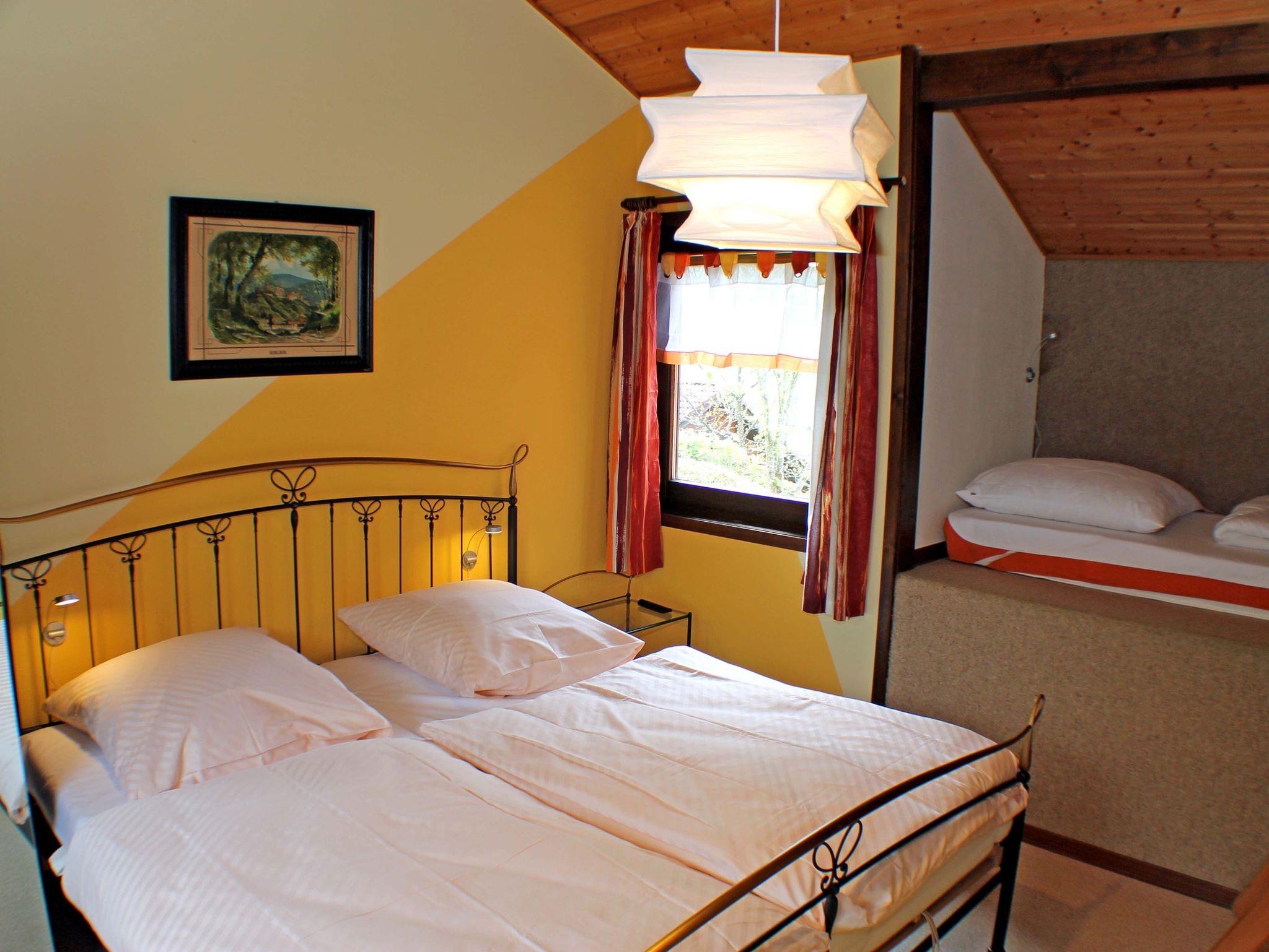 SCHLAFZIMMER 2: Romantisches Bett, funktioneller Schrank, Flat-TV; auf der Empore zwei zusätzliche Schlafplätze