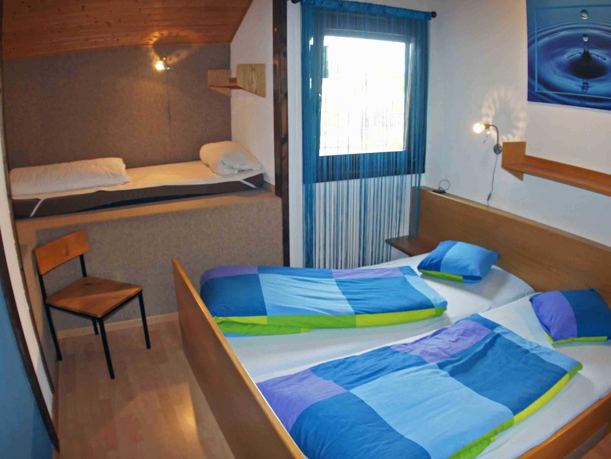 Auf Hohe des Hauseinganges befinden sich die zwei mit Rollladen ausgestatteten Schlafzimmer. Rechts das Ocean-Zimmer mit Doppelbett und zwei Einzelbetten in kuscheliger Nische und links das Brombeerzimmer. Von dieser Ebene fuhrt eine kurze Treppe zum Wohnbereich hinunter. Dieser besteht aus einem Wohnzimmer, modern eingerichtet mit HD-TV, Stereo Anlage mit CD-Player und gemutlichen Sitzgelegenheiten. Die Kuche mit Essecke schliesst sich direkt am Wohnzimmer an. In der Kuche unterstutzen Sie unter anderem eine Kaffeemaschine, ein Kuhlschrank, eine Mikrowelle, ein Backofen, vier Glaskeramik-Kochfelder viel Geschirr und eine Geschirrspulmaschine bei der Erstellung Ihrer schmackhaften Gerichte und beim Abwasch nach dem Genuss dieser. Auf der untersten Ebene des Hauses befindet sich das Badezimmer. Dieses ist ebenfalls modern eingerichtet und ladt zu einem entspannenden Duscherlebnis ein. Ein Haartrockner ist ebenfalls vorhanden.