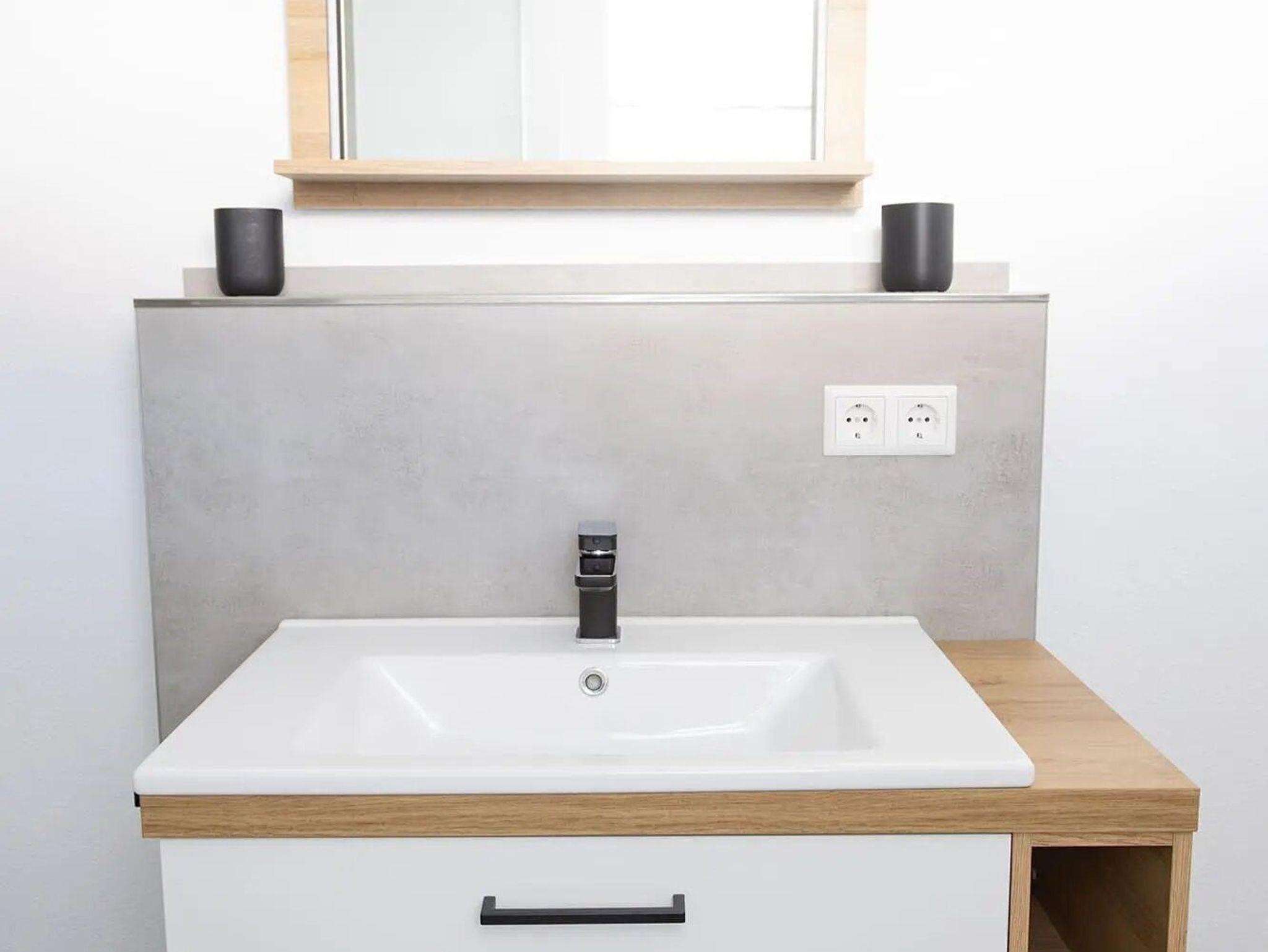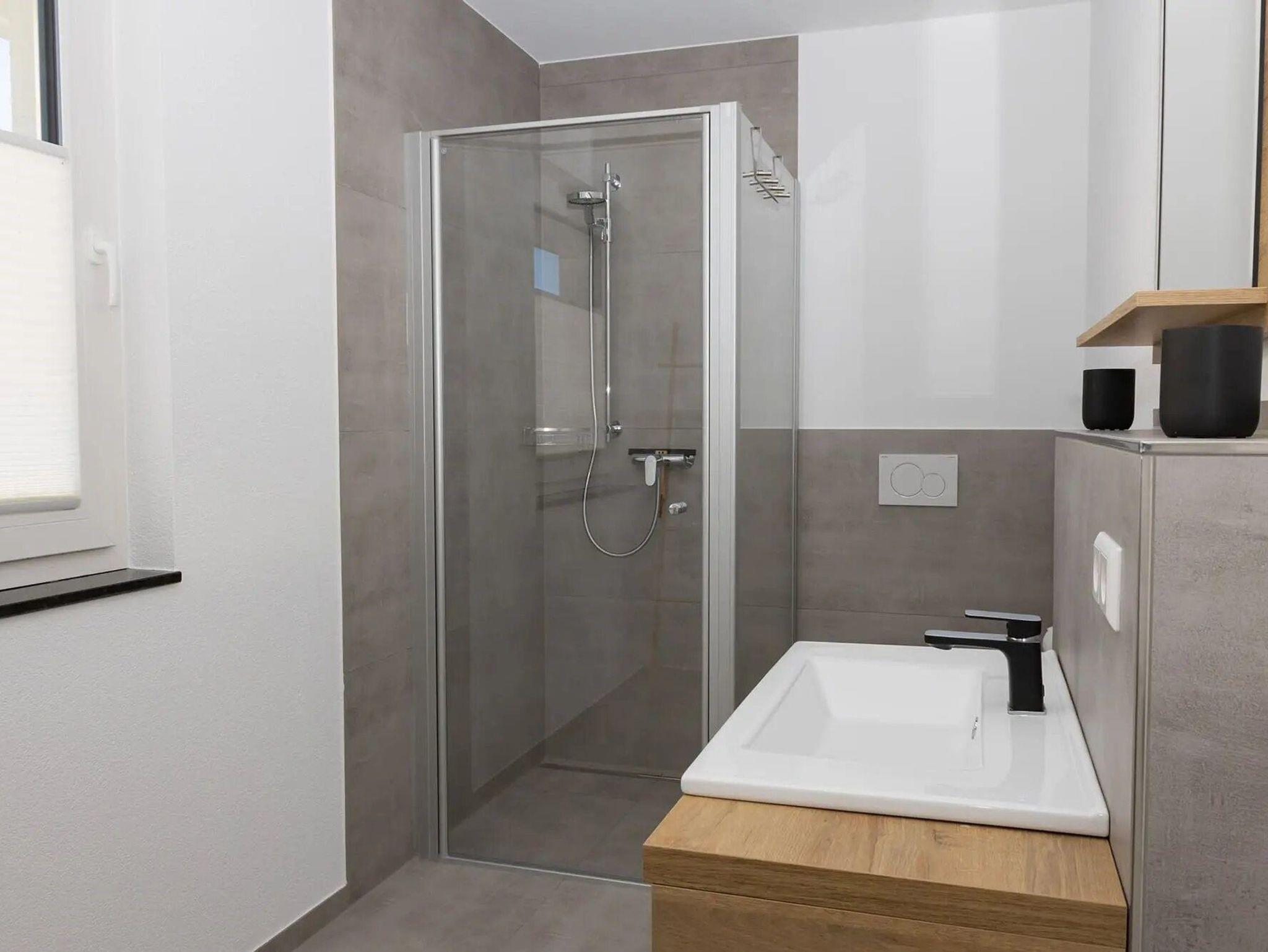 Das Badezimmer verfügt über eine ebenerdige Dusche.