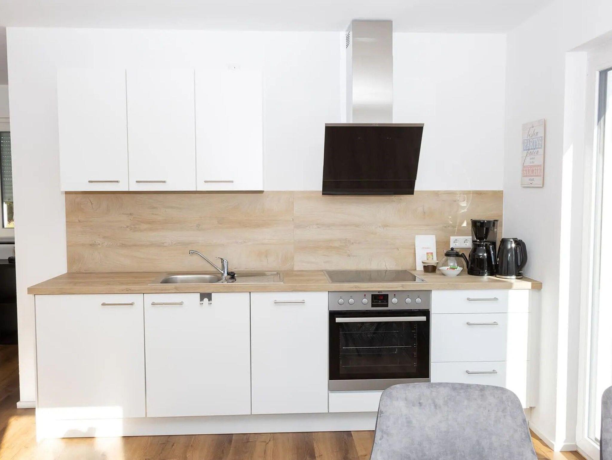 Willkommen in der Ferienwohnung Sonnengruß. Hier erwartet Sie eine Mischung aus modernem Komfort und entspannter Wohlfühlatmosphäre. Die Wohnung ist mit allem ausgestattet, was Sie für einen angenehmen Aufenthalt benötigen. Sie ist ideal für Paare, bietet aber dank eines komfortablen Schafsofas (140x200) Platz für bis zu 4 Personen. Im separaten Schlafzimmer befindet sich ein Boxspringbett (180x200) mit einer Taschenfederkernmatratze. Die moderne Küche ist im Wohn- Essbereich integriert. Sie ist mit einem Geschirrspüler, Kochfeld, Backofen, Toaster, Wasserkocher, Kaffeemaschine und Backofen ausgestattet. Der Kühlschrank hat ein Gefrierfach. Spül- und Geschirrtücher sind vorhanden.