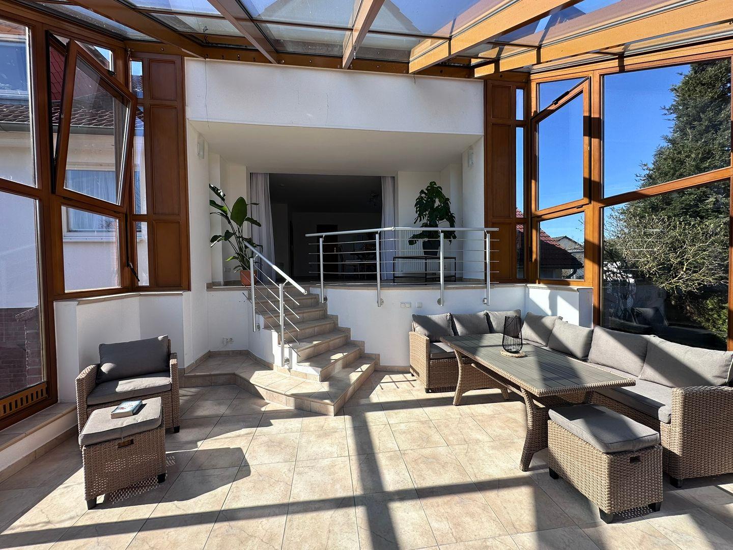 Ein besonderes Highlight des Hauses ist der Wintergarten, der Ihnen einen schönen Blick auf den Garten bietet und sich perfekt eignet, um auch an kühleren Tagen das Tageslicht zu genießen. Die überdachte Terrasse lädt dazu ein, im Freien zu speisen oder einfach nur die Ruhe und den Blick in den Garten zu genießen. Der Garten selbst ist mit Gartenmöbeln und einem Grill ausgestattet, ideal für gesellige Barbecues mit der Familie oder Freunden.