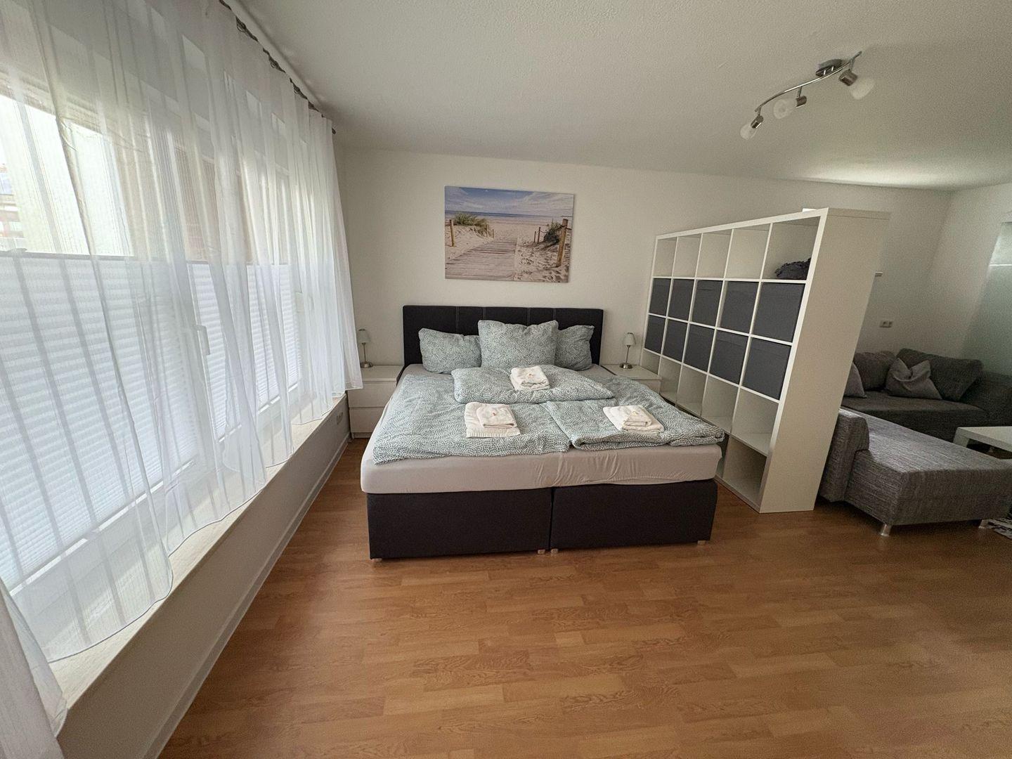 Die Ferienwohnung verfügt über ein komfortables Schlafzimmer und ein einladendes Wohnzimmer, das mit einer Sofaecke und einem Esstisch ausgestattet ist. Die moderne Kochnische, die mit einem Herd, einer Mikrowelle, einem Kühlschrank mit Gefrierfach, einer Spülmaschine und allen notwendigen Küchenutensilien ausgestattet ist, ermöglicht es Ihnen, Ihre eigenen Mahlzeiten zuzubereiten. Natürlich finden Sie hier auch eine Kaffeemaschine, Wasserkocher und Toaster für den perfekten Start in den Tag.
