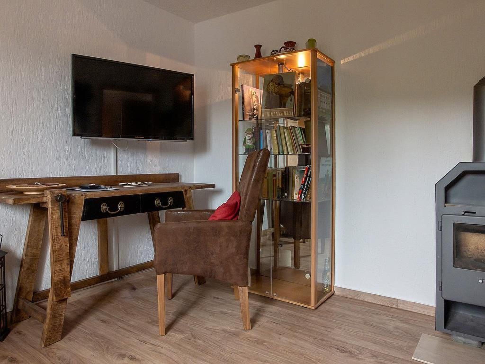 Other living room equipment : Firewood stove, reading corner with small selected library, desk with information material and LAN connection, minibar, wing chair, TV