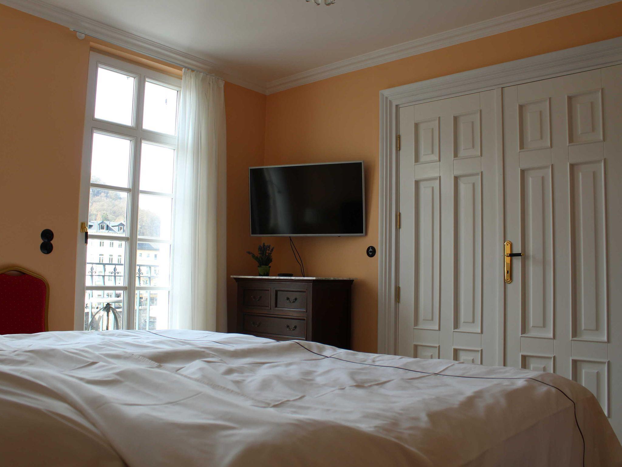 Bad, Wohnzimmer mit Küchenzeile und Balkon mit Blick auf den Fluß und das Kurzentrum. In allen Schlafzimmern befinden sich Flachbildfernseher, die Betten sind mit Boxspringmatratzen und hautfreundlicher Baumwollbettwäsche ausgestattet. Frottierhandtücher und Bademäntel liegen in den Schlafzimmern bereit. Für eine Begleitperson (Übersetzer, Tourist-Guide, Betreuer, etc) besteht die Möglichkeit, ein 1-Zimmer Apartment im 3. OG zu buchen. Alle Wohnungen sind mit einem Aufzug erreichbar.