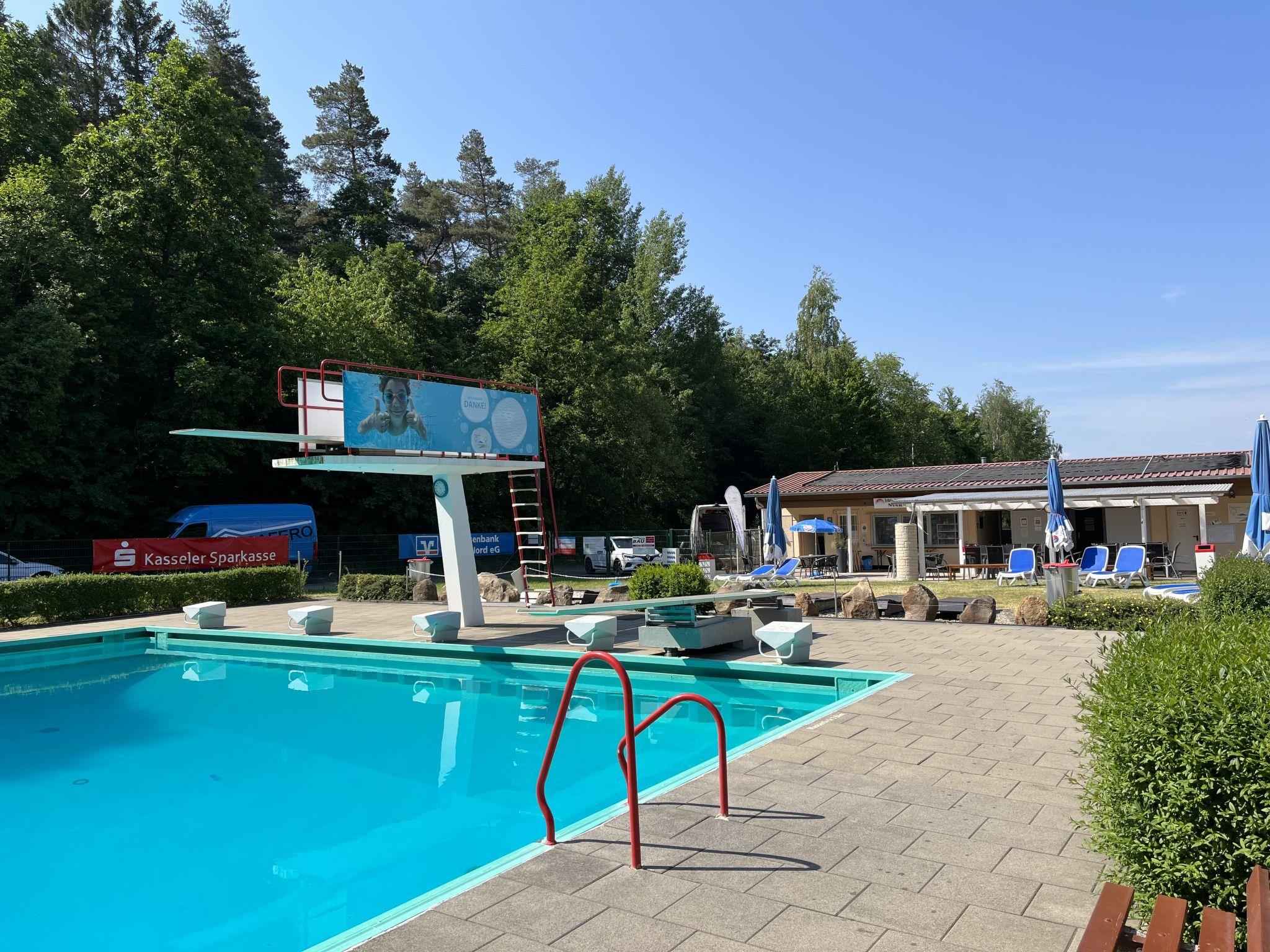 Bungalow "Erzeberg". 800 m from the centre of Balhorn, 5 km from the centre of Bad Emstal, 20 km from the centre of Kassel. For shared use: property 40'000 m2 (fenced), meadow, indoor pool (12 x 4 m, pool opening hours: 09:00-20:00, extra). Boccia. In the complex: reception, restaurant, sauna (extra). Washing machine, tumble dryer (for shared use, extra). Parking. E-charging station. Supermarket 1 km, bus stop "Balhorn Distelberg" 2 km, outdoor swimming pool 1 km. The bungalow-style holiday homes are located separately on the campsite. Fenced property (electric entrance gate).