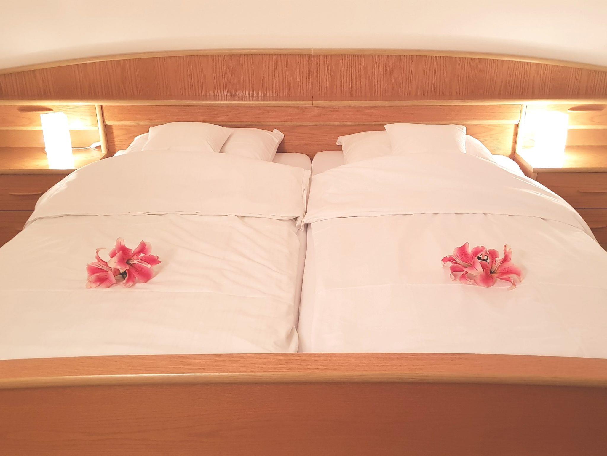 Die Ferienwohnung verfügt über einen gemütlichen Wohnraum mit einer gut ausgestatteten Küchenzeile und ein separates Schlafzimmer. Das komfortable Doppelbett (2 x 2 m) mit zwei getrennten Matratzen garantiert einen erholsamen Schlaf und sorgt für Ihr Wohlbefinden.