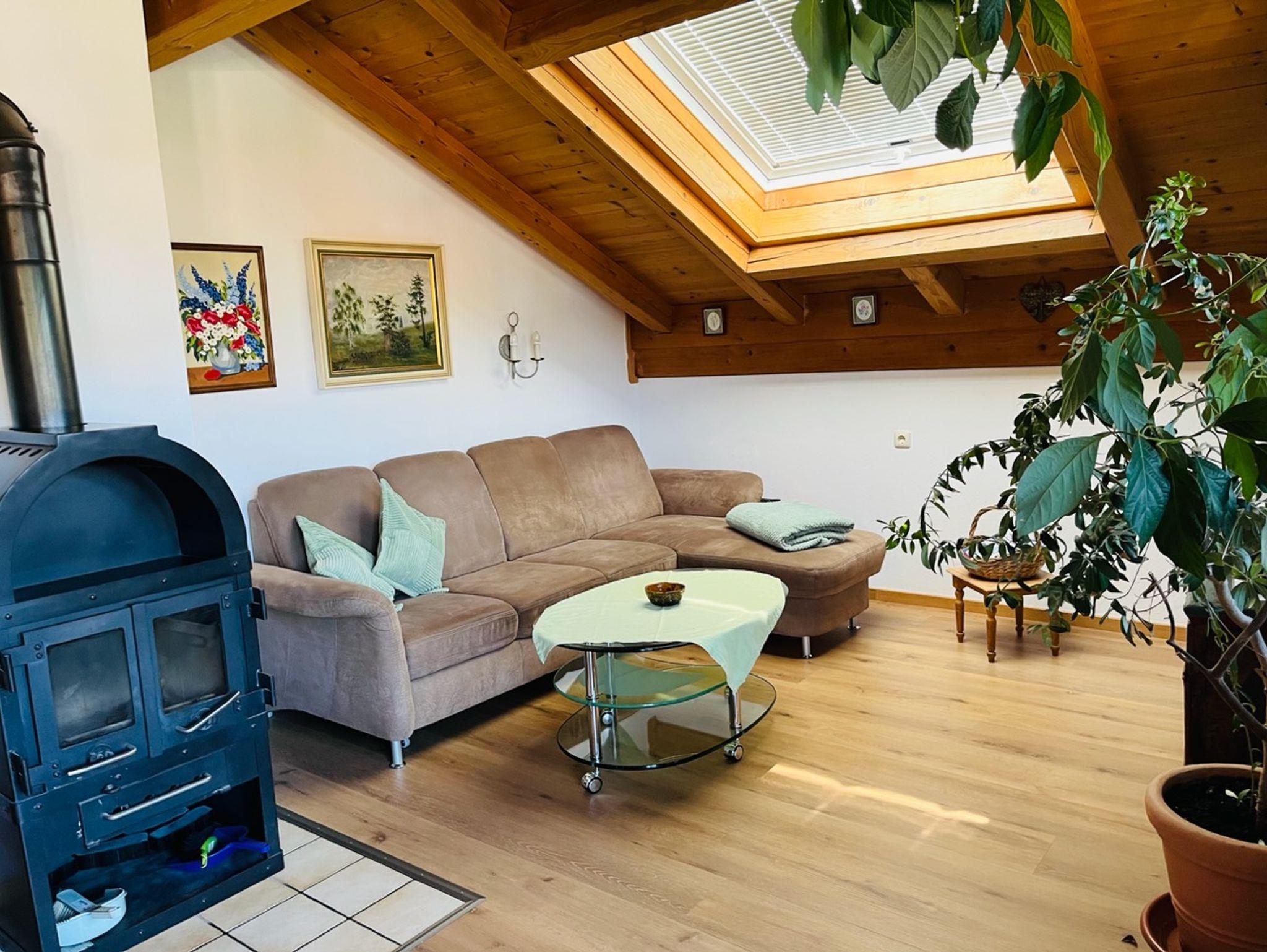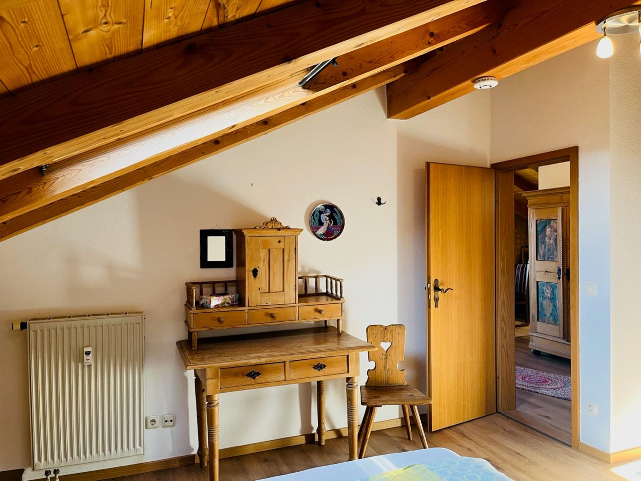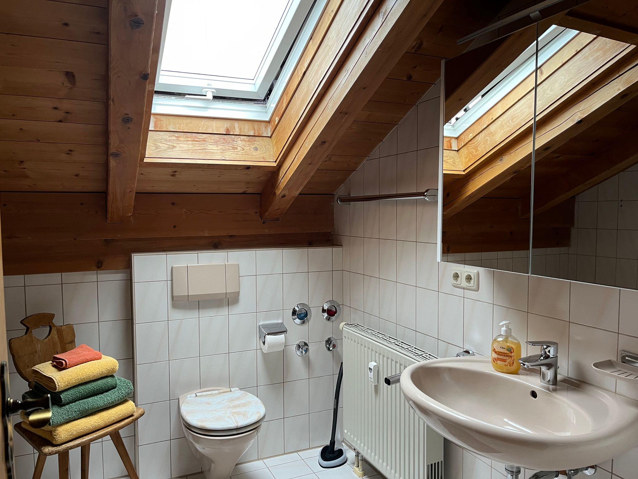 Ferienwohnung mit Bad mit Dusche, Wanne und WC. Sat-TV, Radio, Dänischer Kaminofen, Balkonsitzgruppe, Fahrradunterstand, Bandscheibenmatratzen, Möblierung ist im bayerischen Landhausstil. Die Wohnung befindet sich im Haus Herbststr. 10/ Dachgeschoss (ca. 80 Meter vom Haupthaus Haus Oberland entfernt).