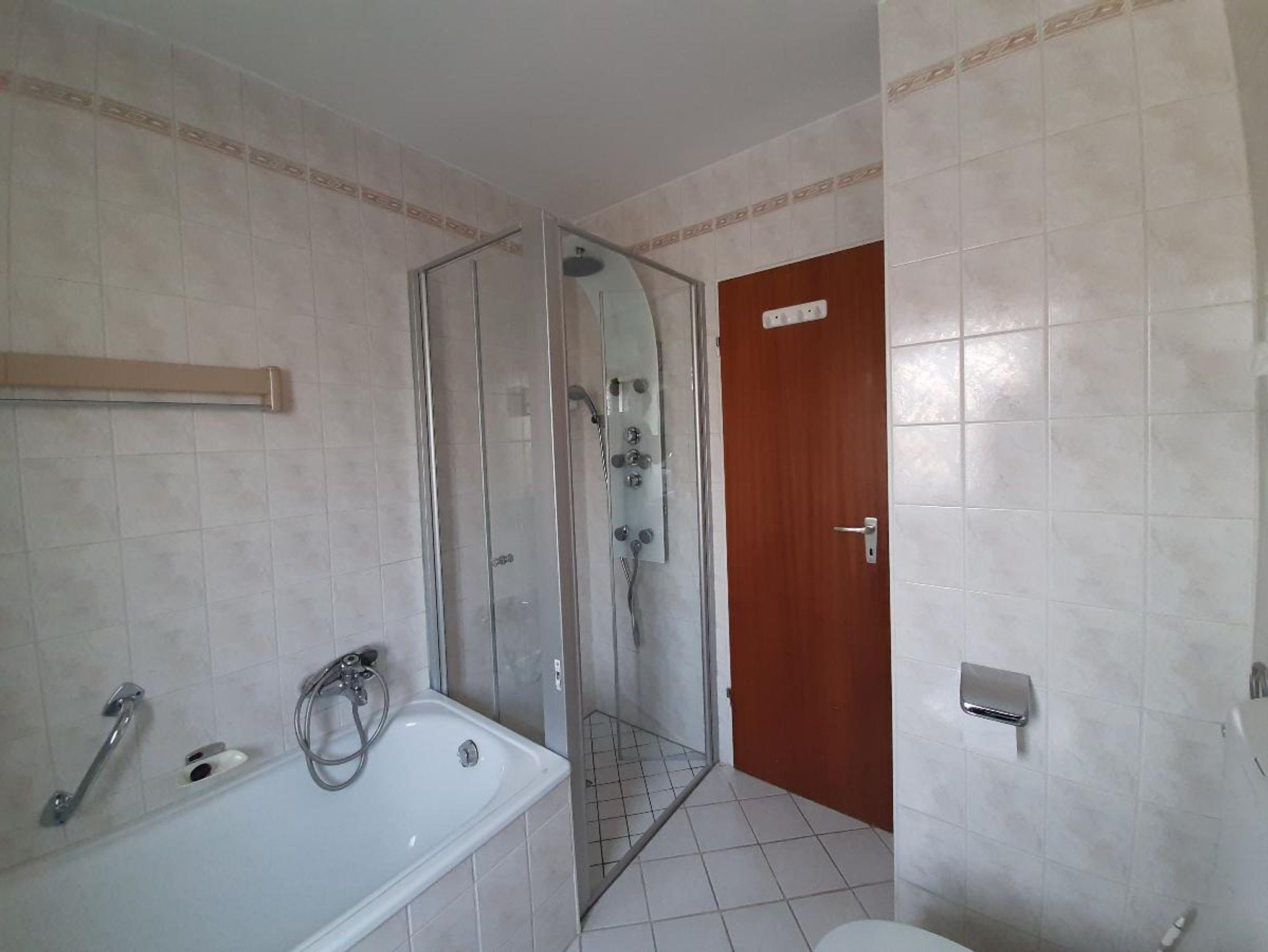Das moderne Bad ist sowohl mit einer Dusche als auch einer Badewanne und Fön ausgestattet.