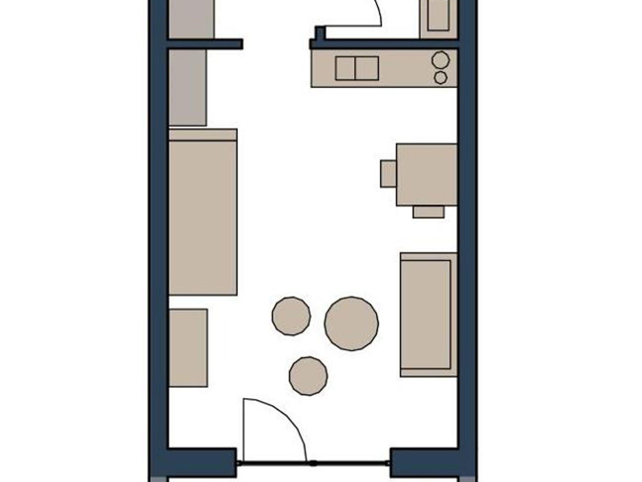Im 1. OG mit 1 Balkon, Einzelbett, WC mit Dusche, Couchgarnitur, Esstisch und moderner Küchenzeile mit Spülmaschine mit ca. 28 qm Wohnfläche für 1 Person.