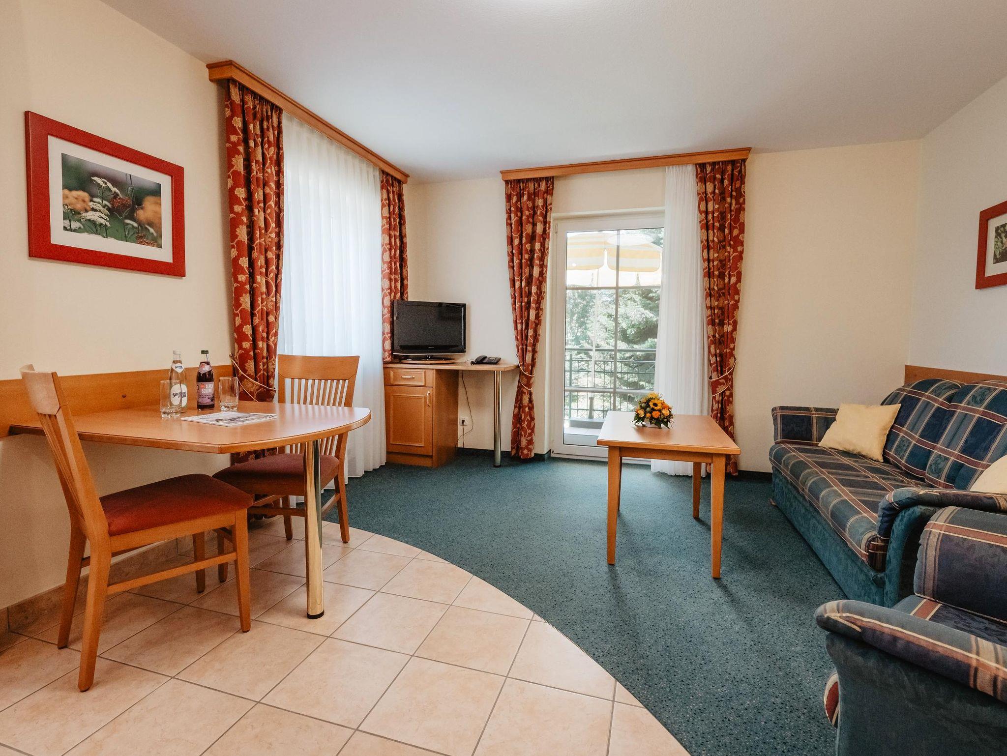 Kuren u. Erholen in komf. 1-2 Zimmer- App. mit Balkon, Du/WC getrennt, Familienbetrieb, Nichtraucherhaus, sehr ruhige Lage - mitten im Grünen am Ende einer kurzen Sackgasse, jedoch direkt im Ort, Geschäfte und Massagepraxen sind nur 120 m, eine Bushaltestelle 50 m entfernt.