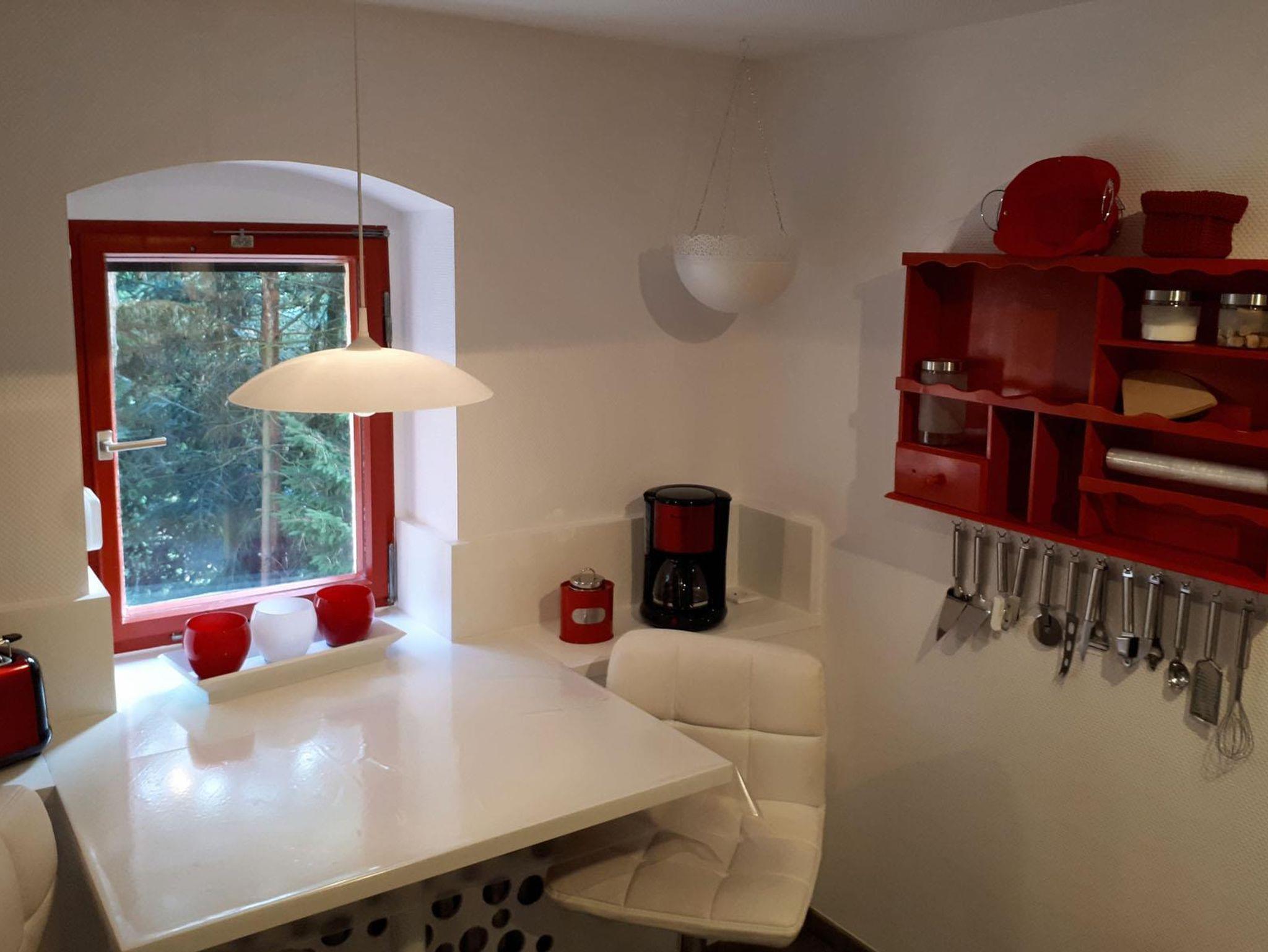 Die moderne Küche schließt sich direkt an, ist ausgestattet mit einer Kühl-Gefrierkombination, Elektroherd mit Backofen, Mikrowelle, Kaffeemaschine, Toaster und Wasserkocher, ausreichend Geschirr steht zur Verfügung.