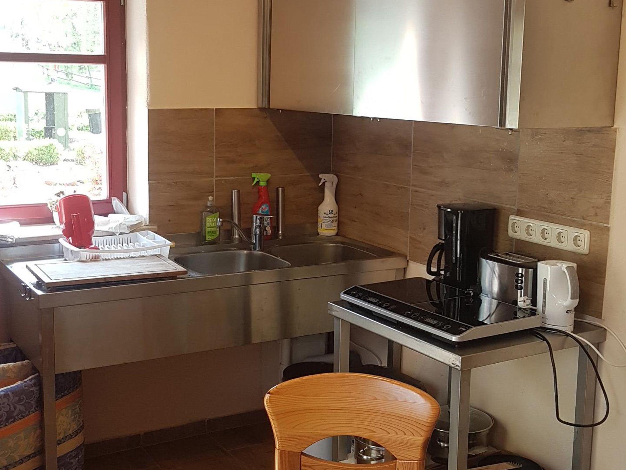 Im Nebengebäude - gleich links neben dem Waggon - befinden sich Dusche, WC sowie die Küche mit Küchenzeile, TV und Essplatz.