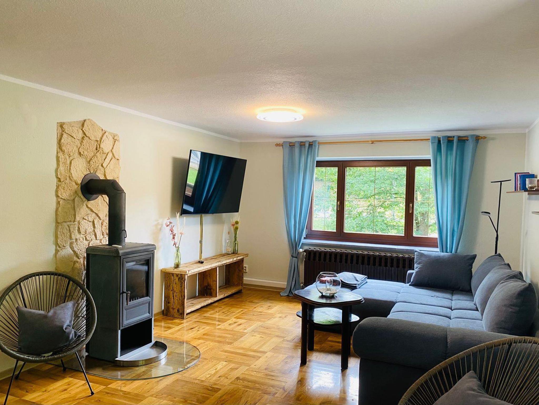 Im Erdgeschoss befindet sich ein großzügiger Wohnraum mit einer gemütlichen Couch, TV und einem Kaminofen, sowie einer weiteren Sitzecke z.B. für Spielabende. Kaminholz könnt ihr vor Ort zum Preis von 10,00 € pro Korb ordern.