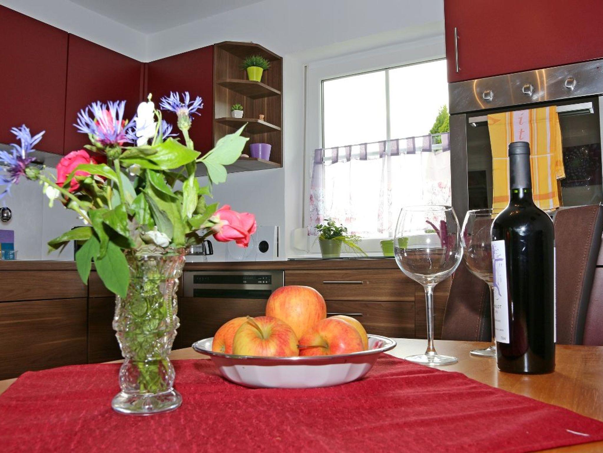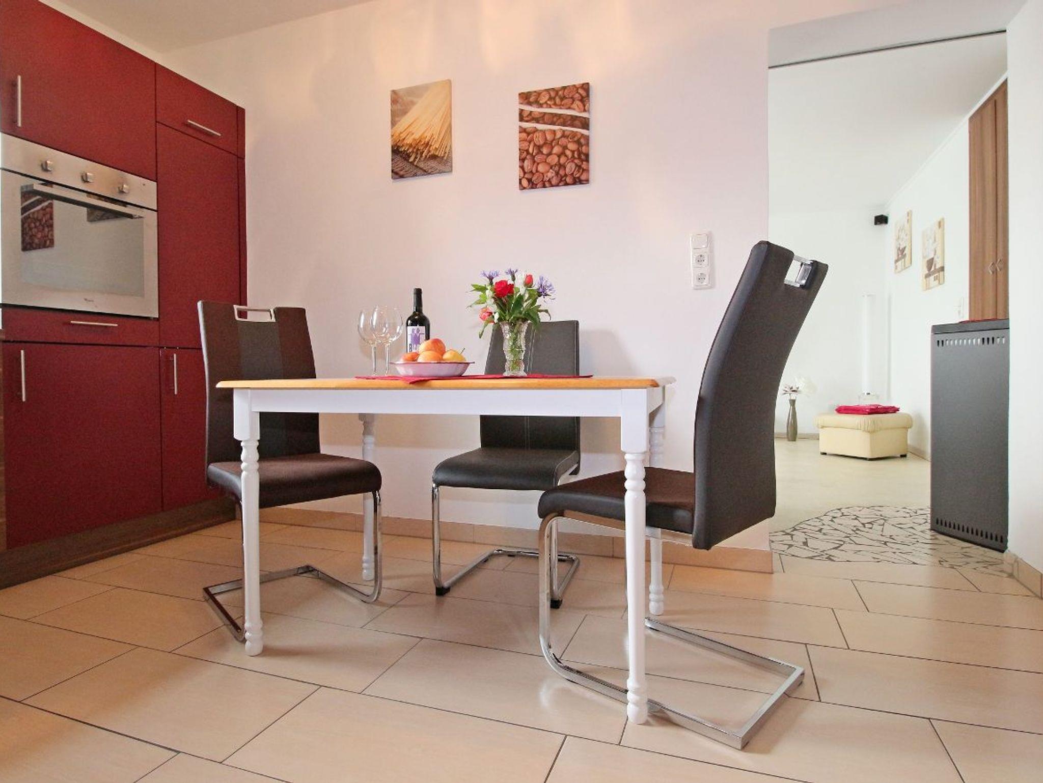 Unsere komfortable FeWo. hat ca. 60 m² Wohnfläche und bietet Platz für 3 Personen. Die Wohnung verfügt über ein Schlafzimmer mit Boxspringbett und Schwebetürenschrank mit Spiegel. Das gemütliche Wohnzimmer mit Schlafcouch und Flachbild TV, sowie einem Pelletofen, lädt sie zum verweilen ein. Die komplett ausgestattete Küche mit Geschirrspüler, Kühlschrank mit TK Fach, Elektroherd und Backofen, Microwelle, Wasserkocher, Eicherkocher, Toaster, Kaffeemaschine lässt keine Wünsche offen. Das moderne Badezimmer mit ebenerdiger Dusche, Badewanne und Handtuchtrockner,sowie Spiegelschrank rundet das Gesamtbild ab. Außerdem steht eine Waschmaschuine zur Verfügung. Bereits zum Frühstück können sie die Sonnenstrahlen auf unserer Terrasse genießen.