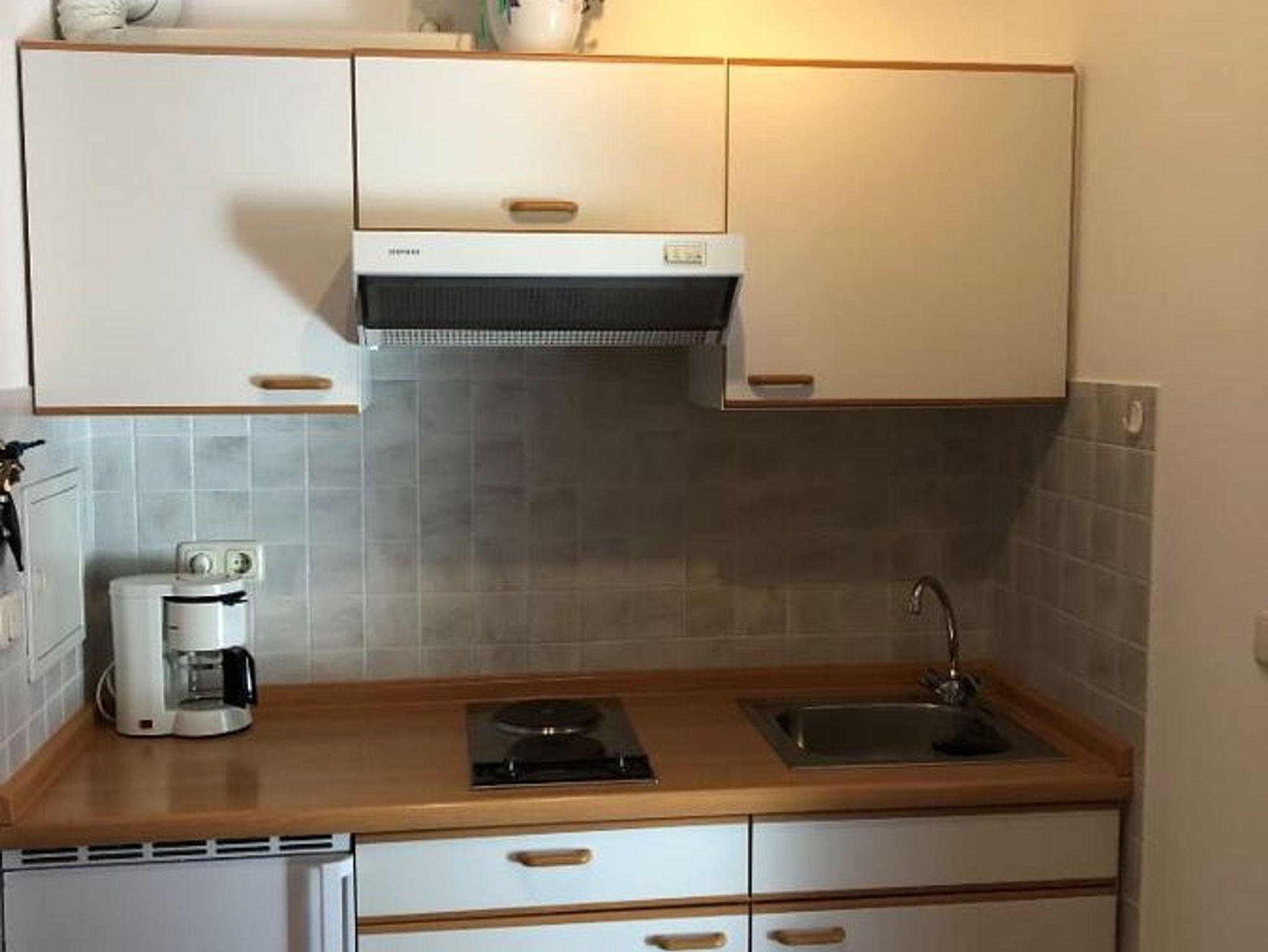 Wohnschlafraum mit Doppelbett, Couch, Esstisch, Radio/'TV, Balkon, Kochnische mit Kühlschrank, Kochplatte, Mikrowelle, Kaffeemaschine, Toaster, Wasserkocher, geräumiges Bad mit Badewanne u. Fenster, Wäscheständer, Balkonmöbel, Reinigungsmittel, Toiletten-