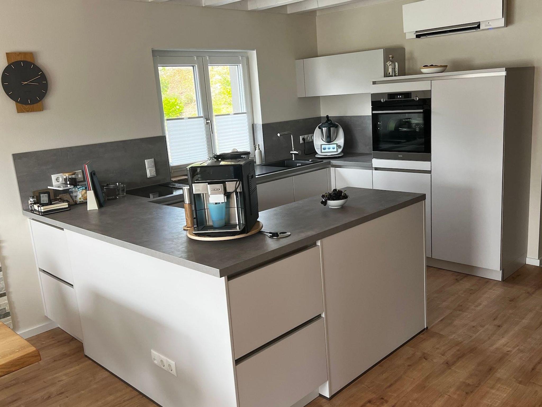 -offene Küche mit Backofen, Kühlschrank, Kaffeemaschine, Wasserkocher, Toaster