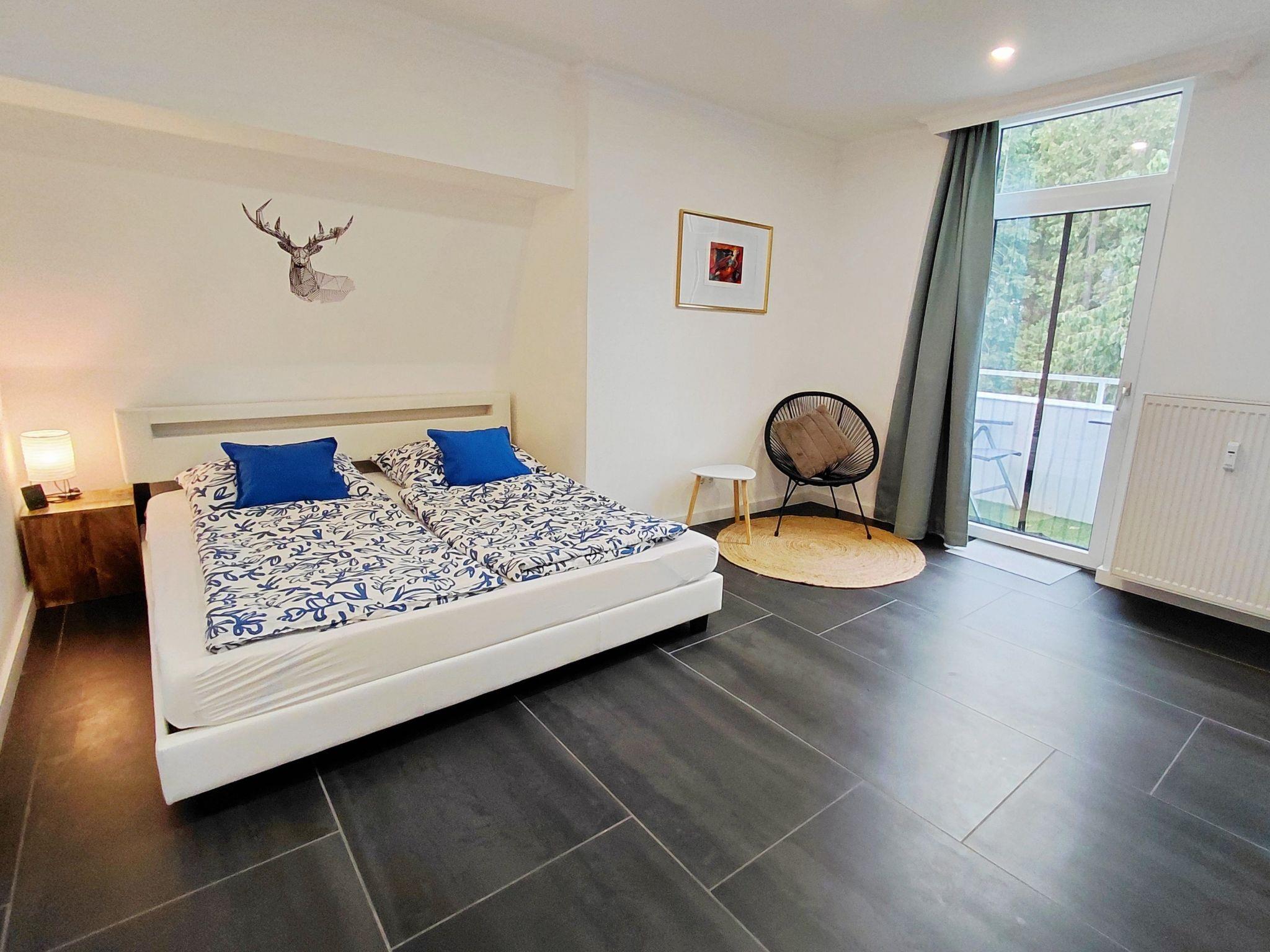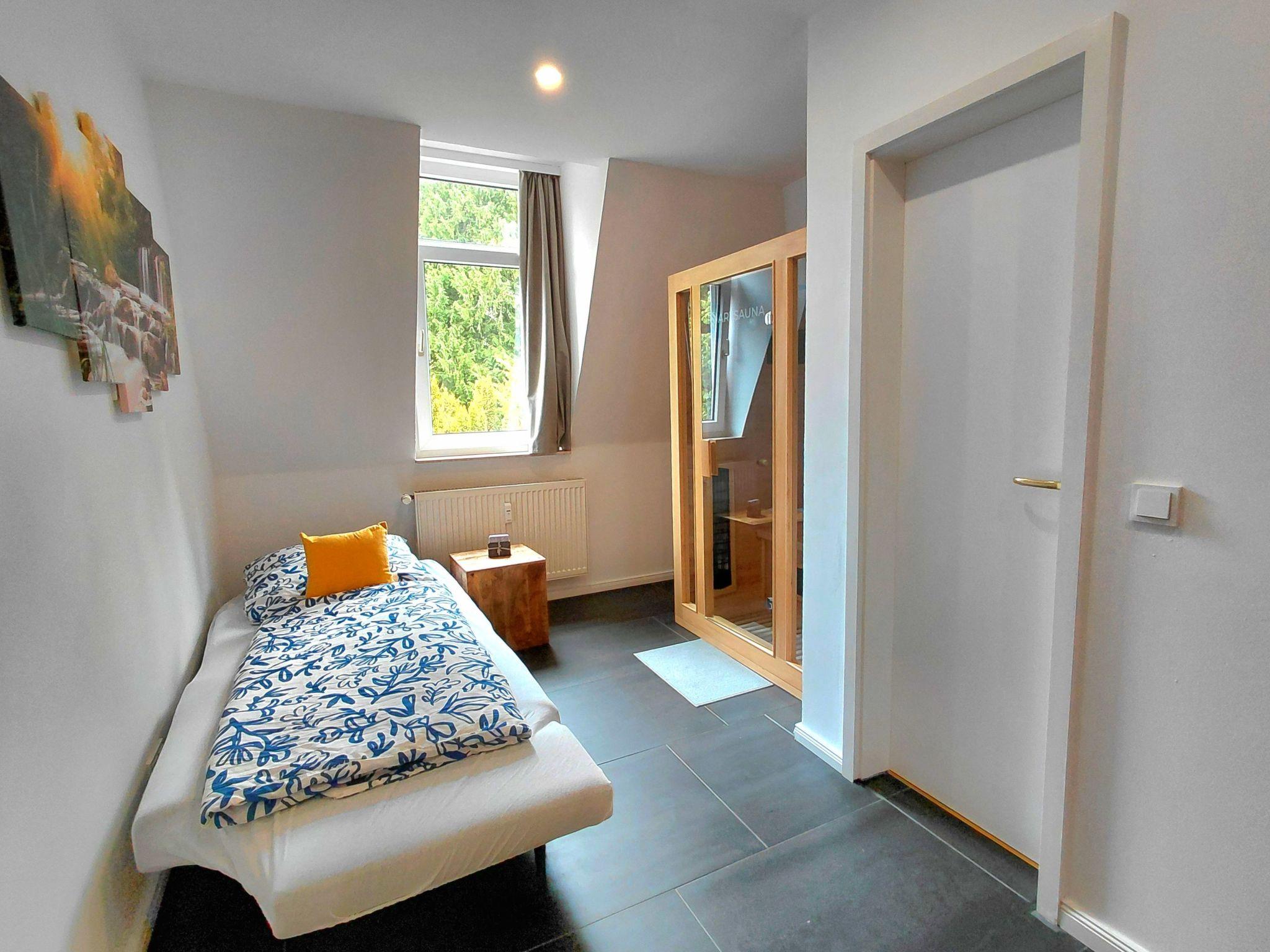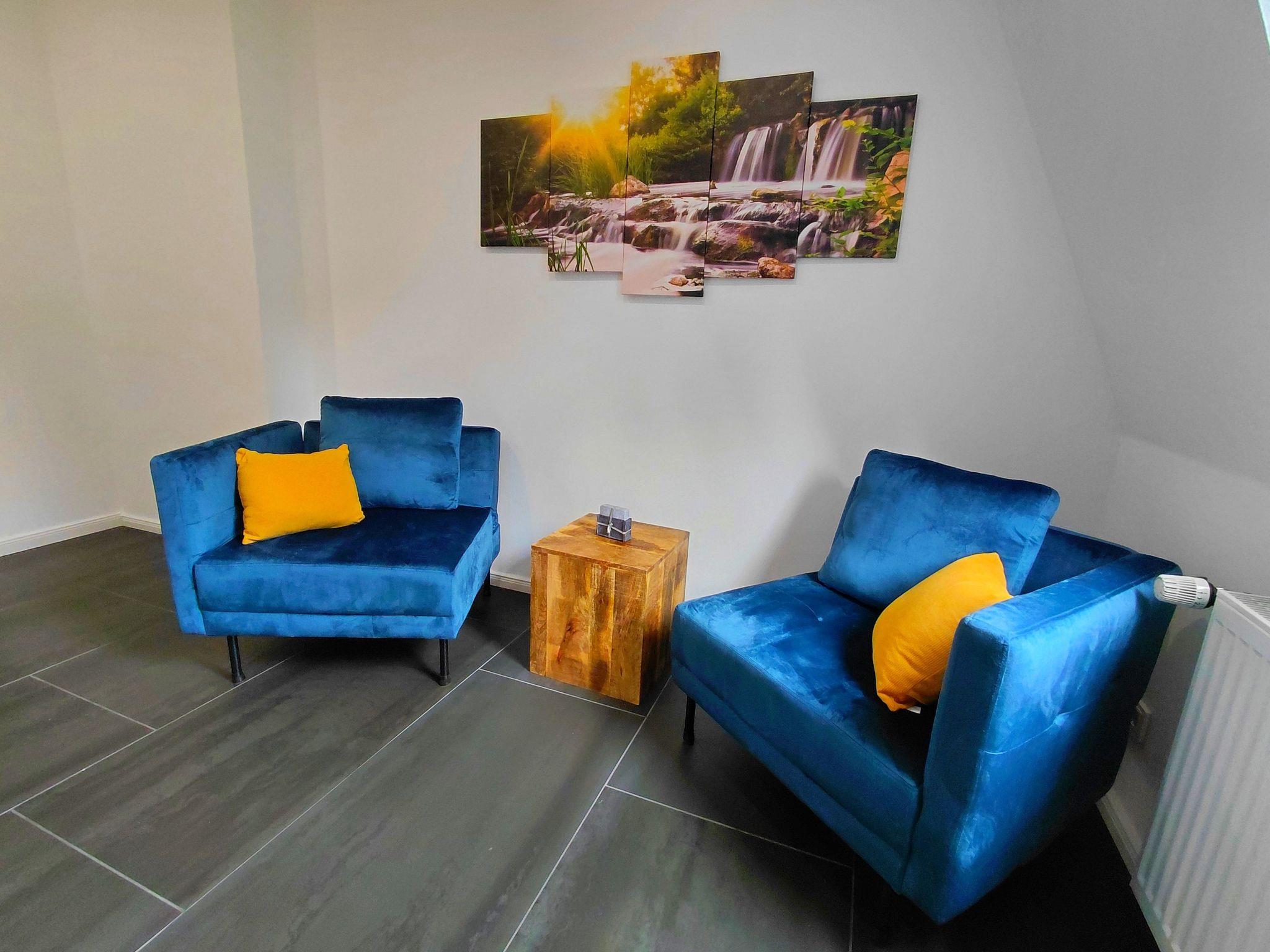 Inside, the flat boasts two cosy bedrooms, each with its own bathroom, making it ideal for families or small groups. Complete blackout facilities ensure a restful night's sleep. A special feature is the additional room with infrared sauna and armchairs that can be converted into a sofa bed, including the third bathroom with bathtub. The light-flooded rooms open out onto two balconies, from which you can enjoy a magnificent view over Bad Harzburg. Further facilities include a traditional and capsule coffee machine as well as a washing machine and tumble dryer.