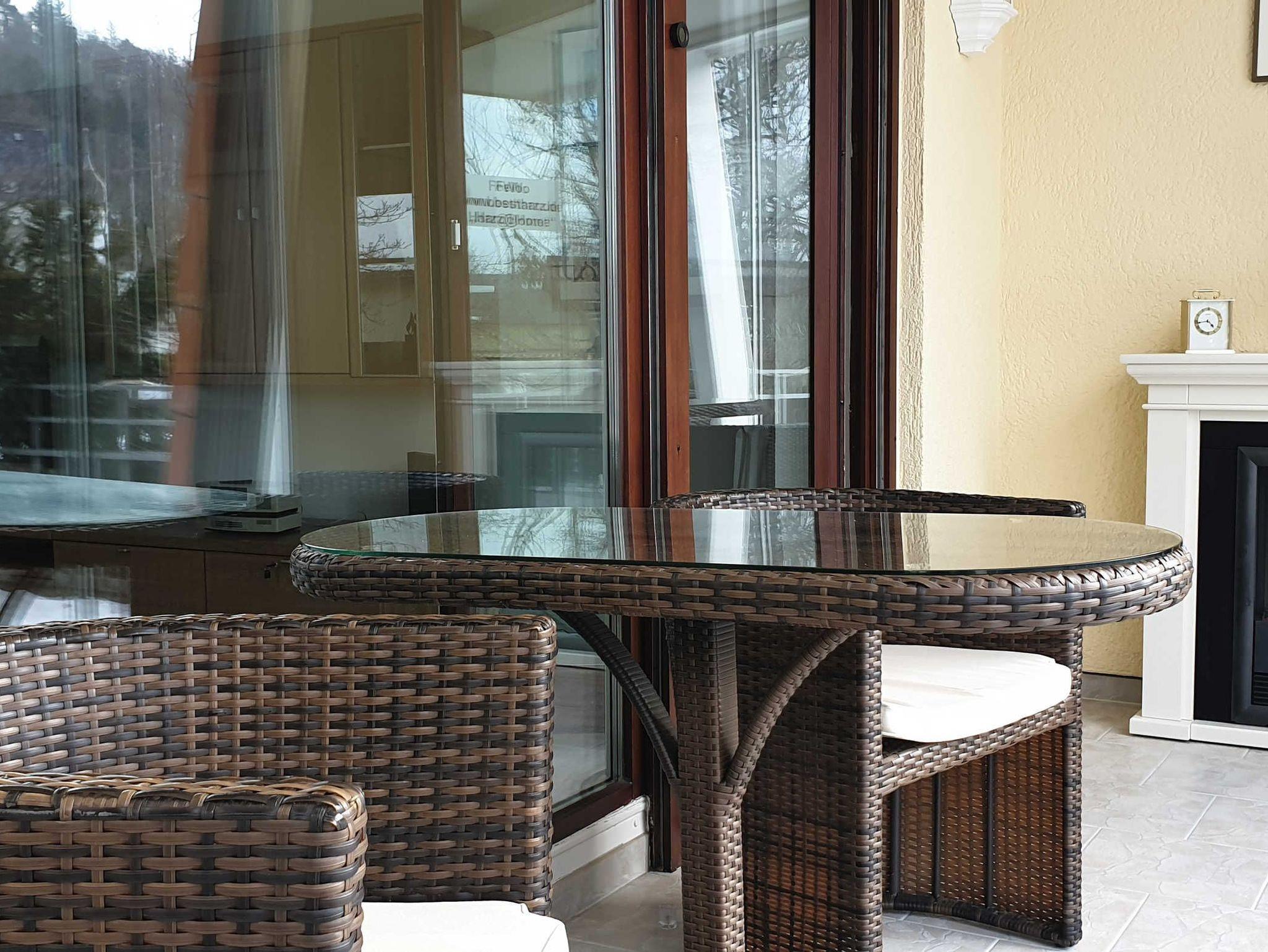 Wintergarten mit elektrischem Kamin (keine Heizfunktion), 2 Sesseln und Tisch