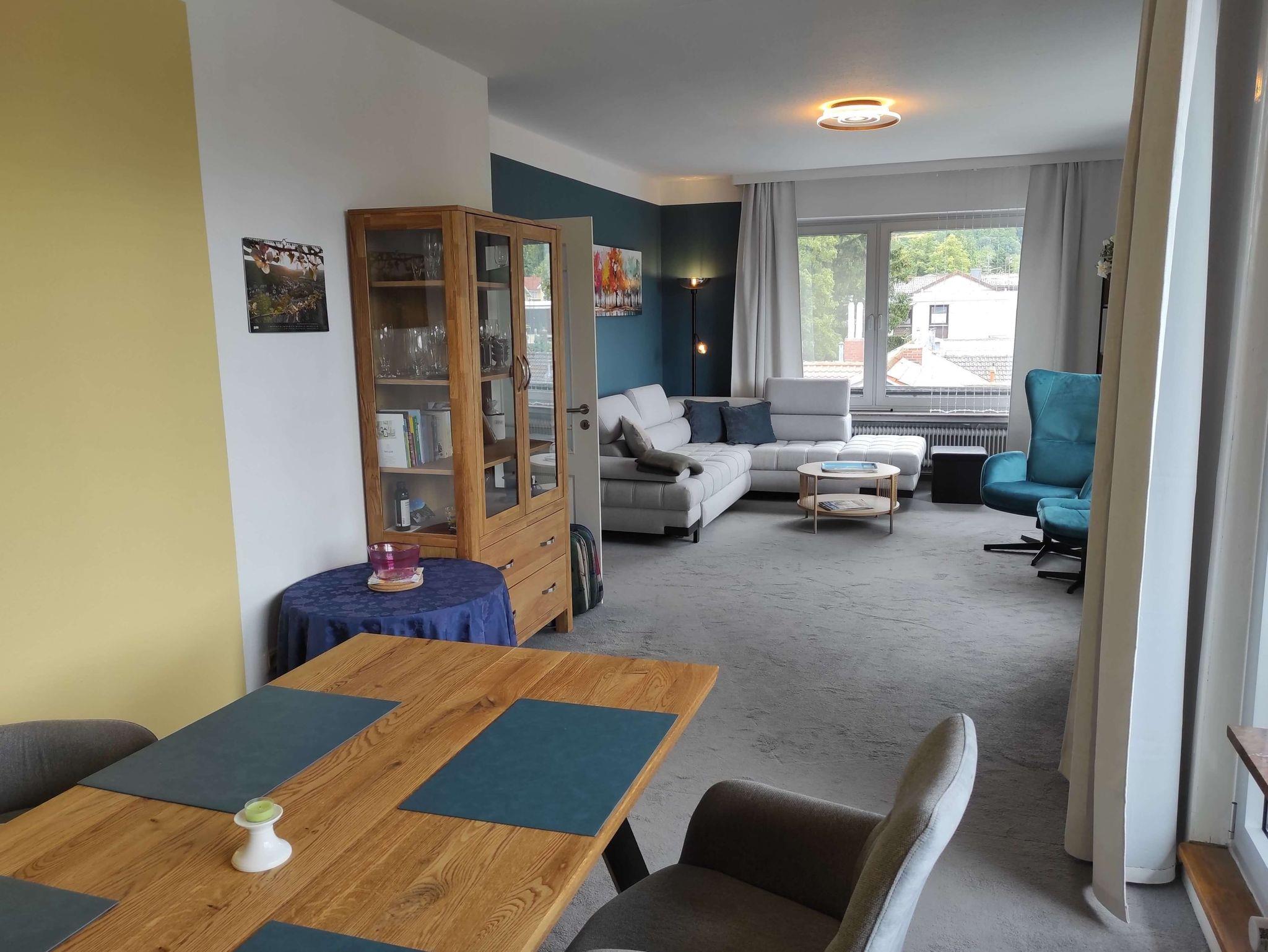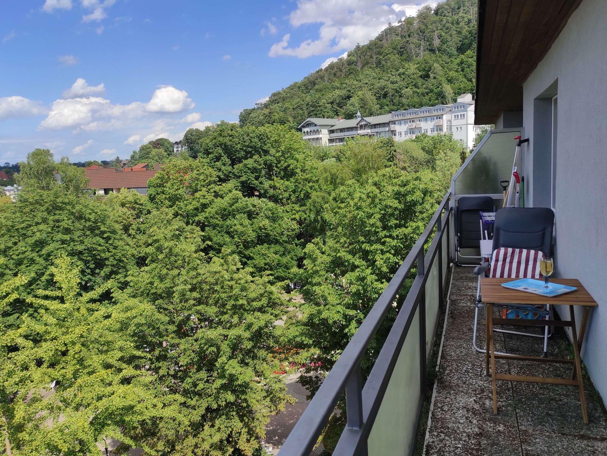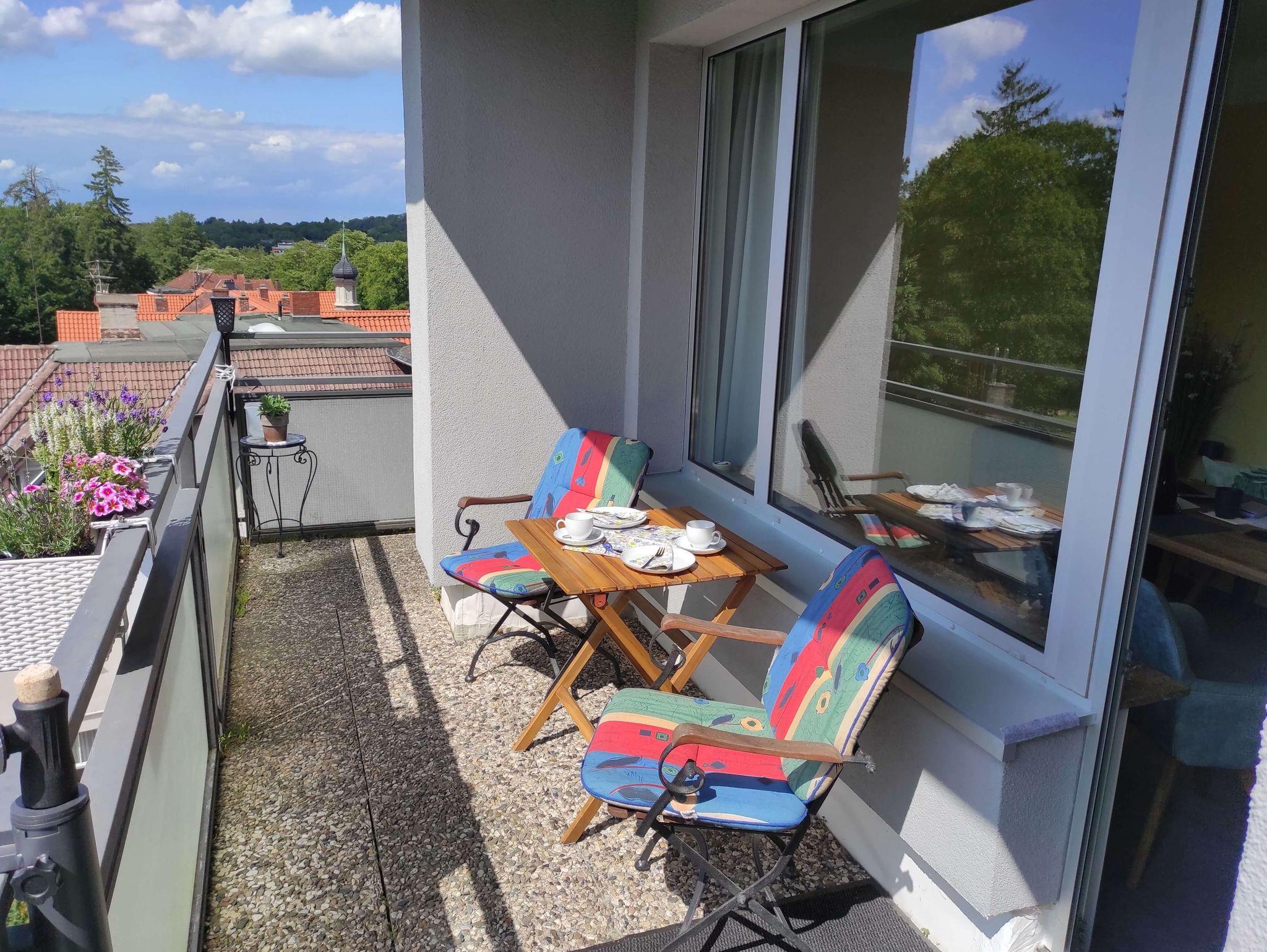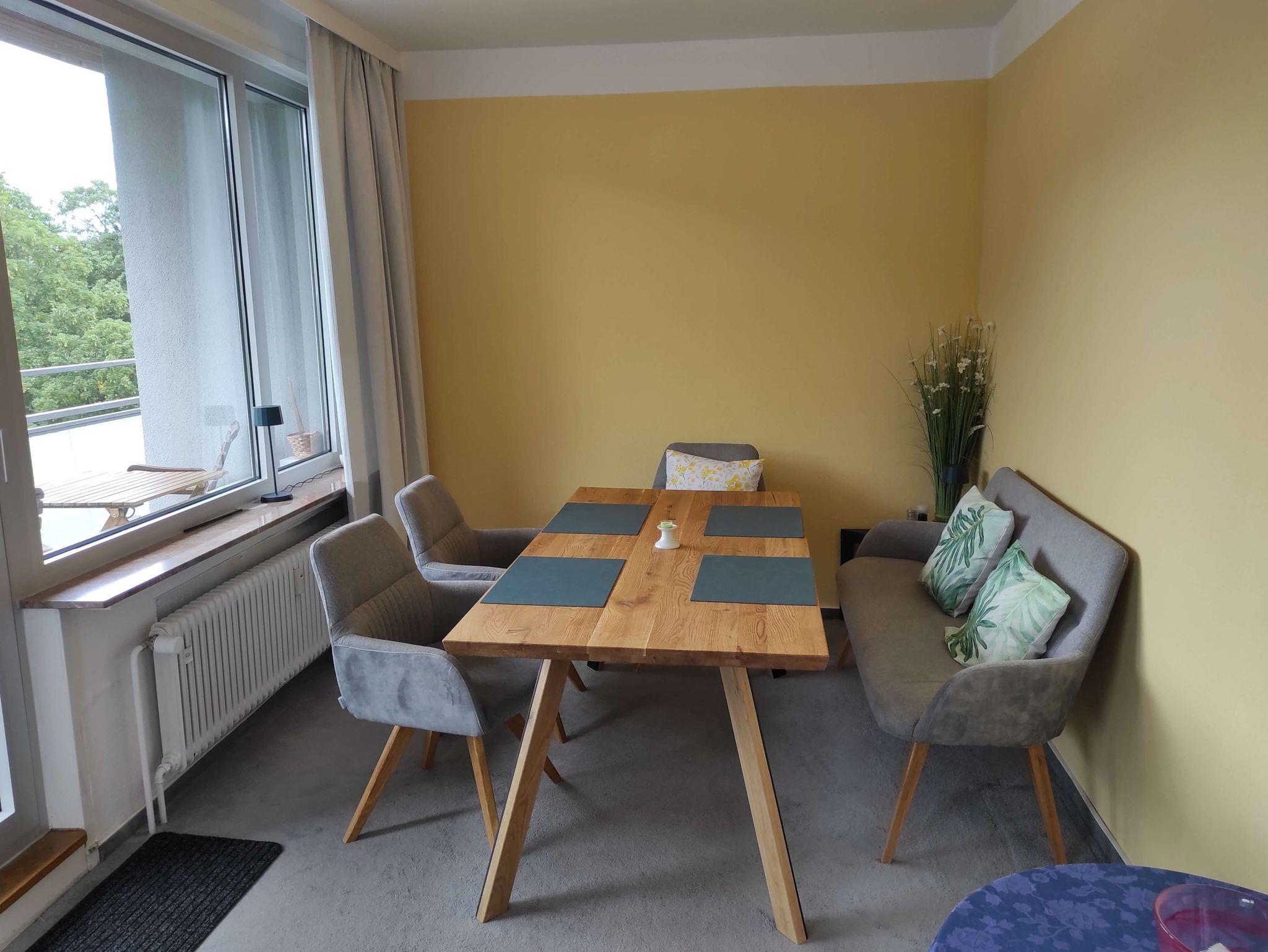 Vom Wohnzimmer aus gelangen Sie auf den Eckbalkon, der auf zwei Seiten eine herrliche Aussicht und Ruhe bietet. Ein schönes Essen, oder etwas spielen können Sie am Esstisch vor dem großen Fenster. Das Rauchen ist lediglich auf dem Balkon, bei geschlossener Tür und mitgebrachtem Aschenbecher, gestattet.