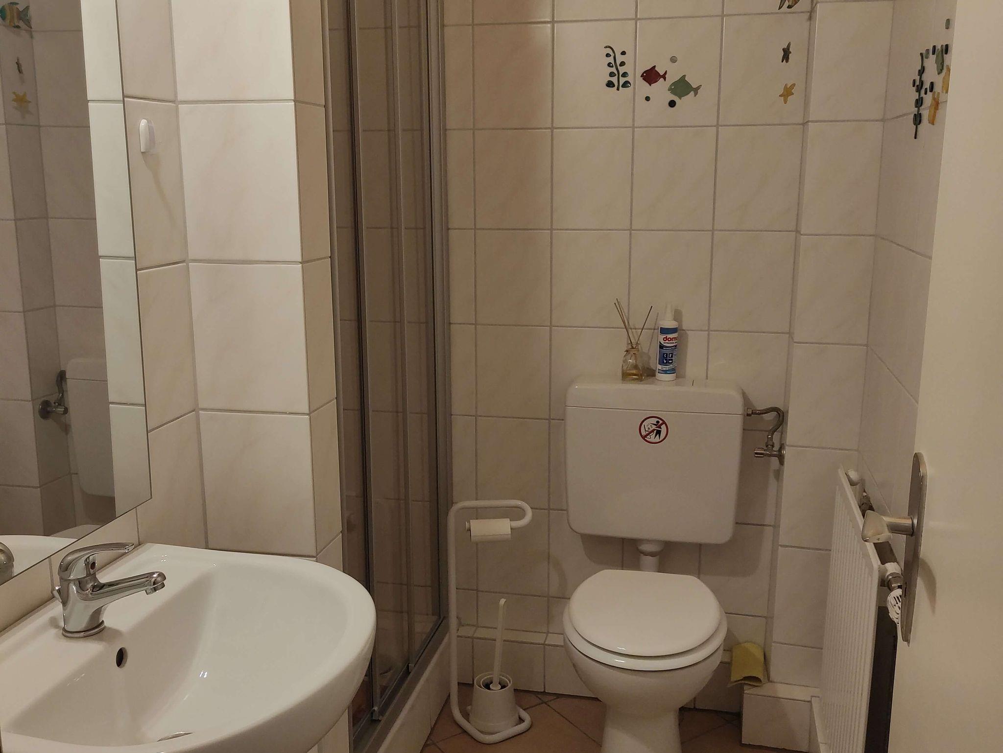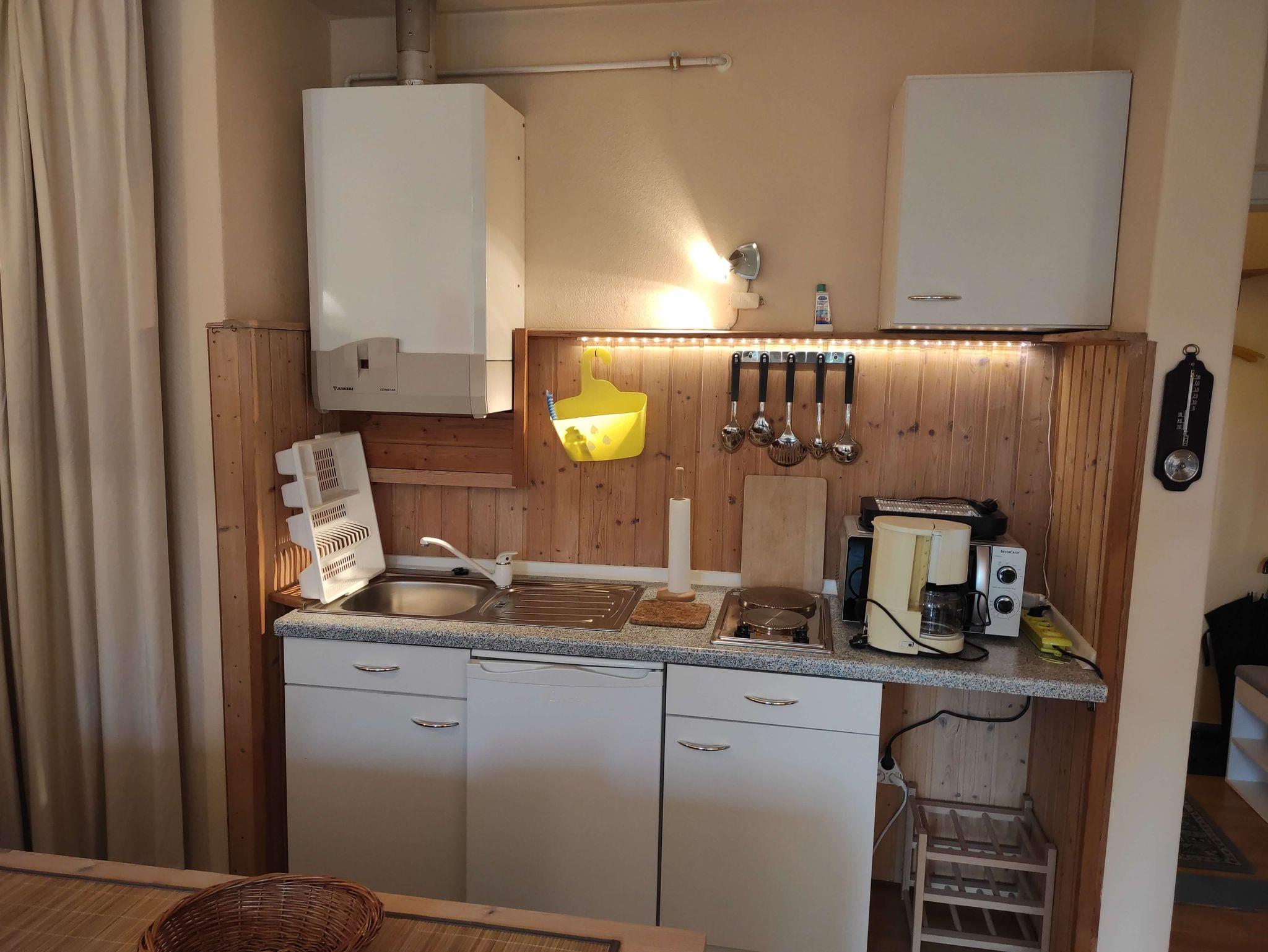 Im Bad mit WC und Dusche steht auch ein Föhn zur Verfügung. Die Küchenzeile mit Herd, Mikrowelle, Kühlschrank, Kaffeemaschine, Wasserkocher usw. ist mit ausreichend Geschirr und Besteck sowie weiteren Küchenutensilien ausgestattet.
