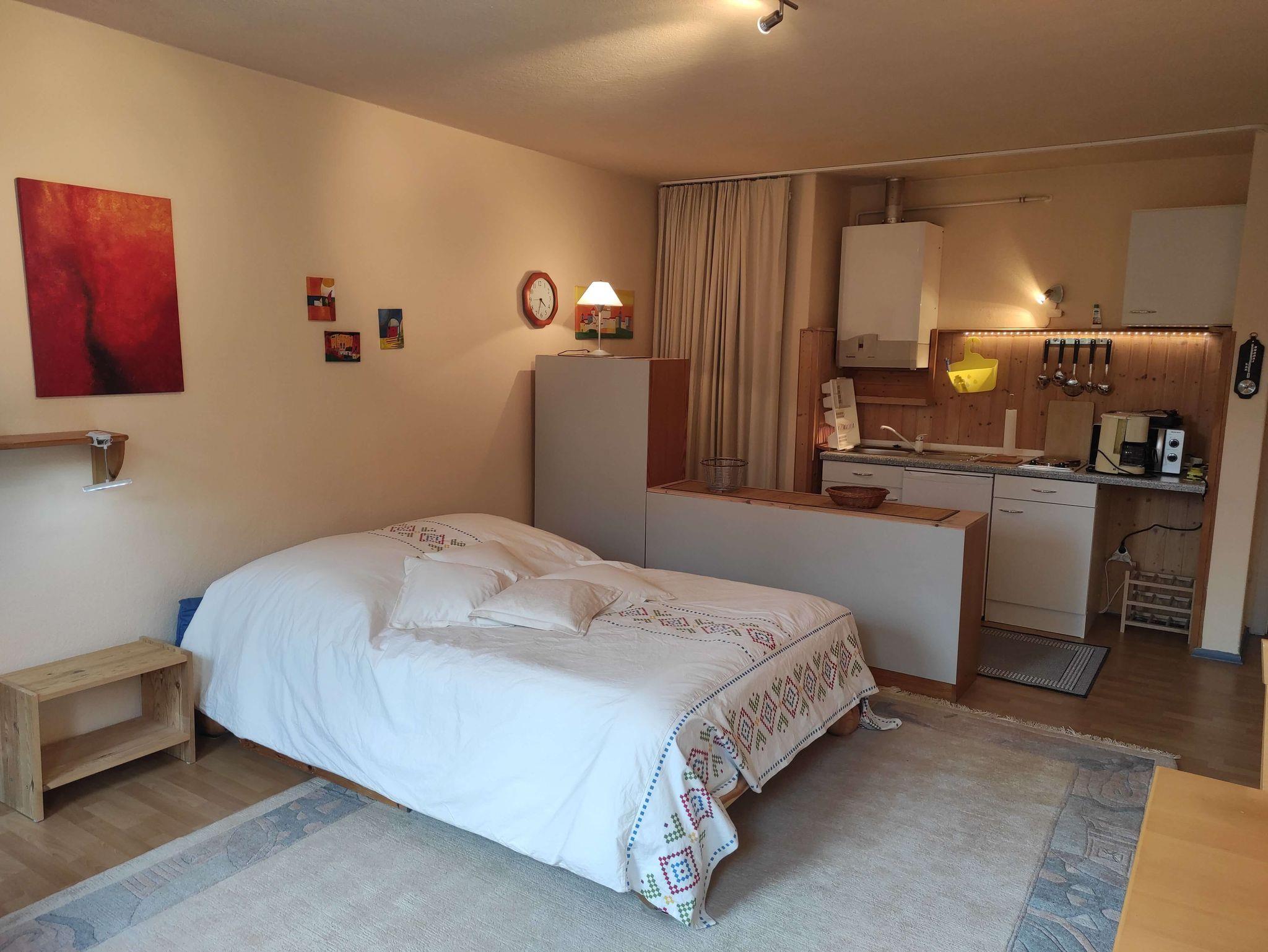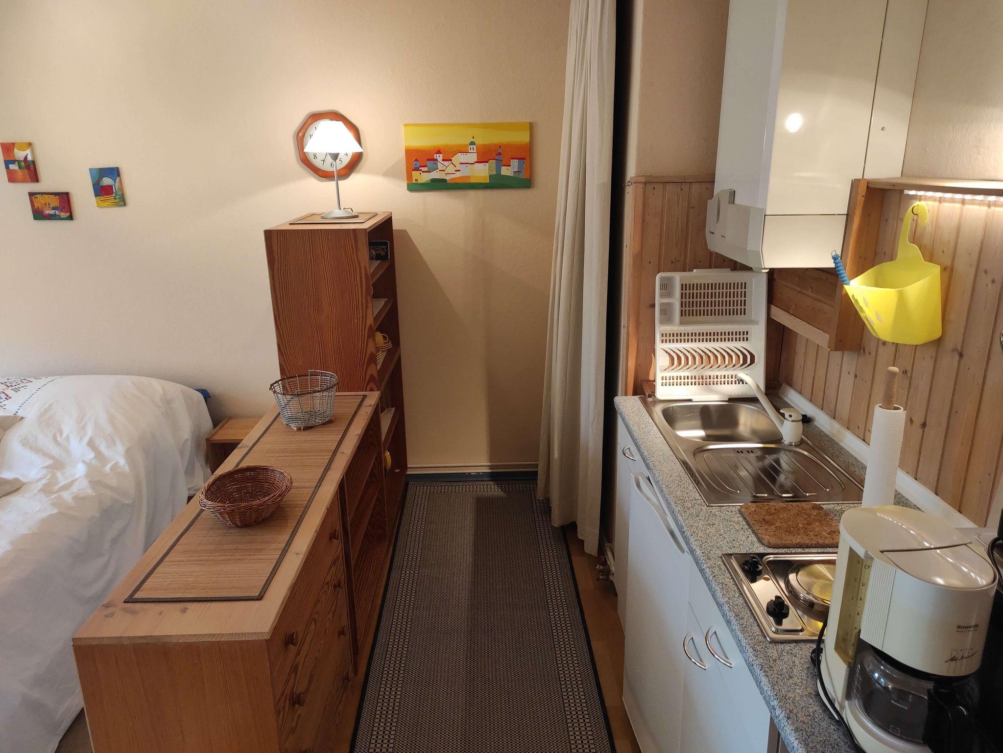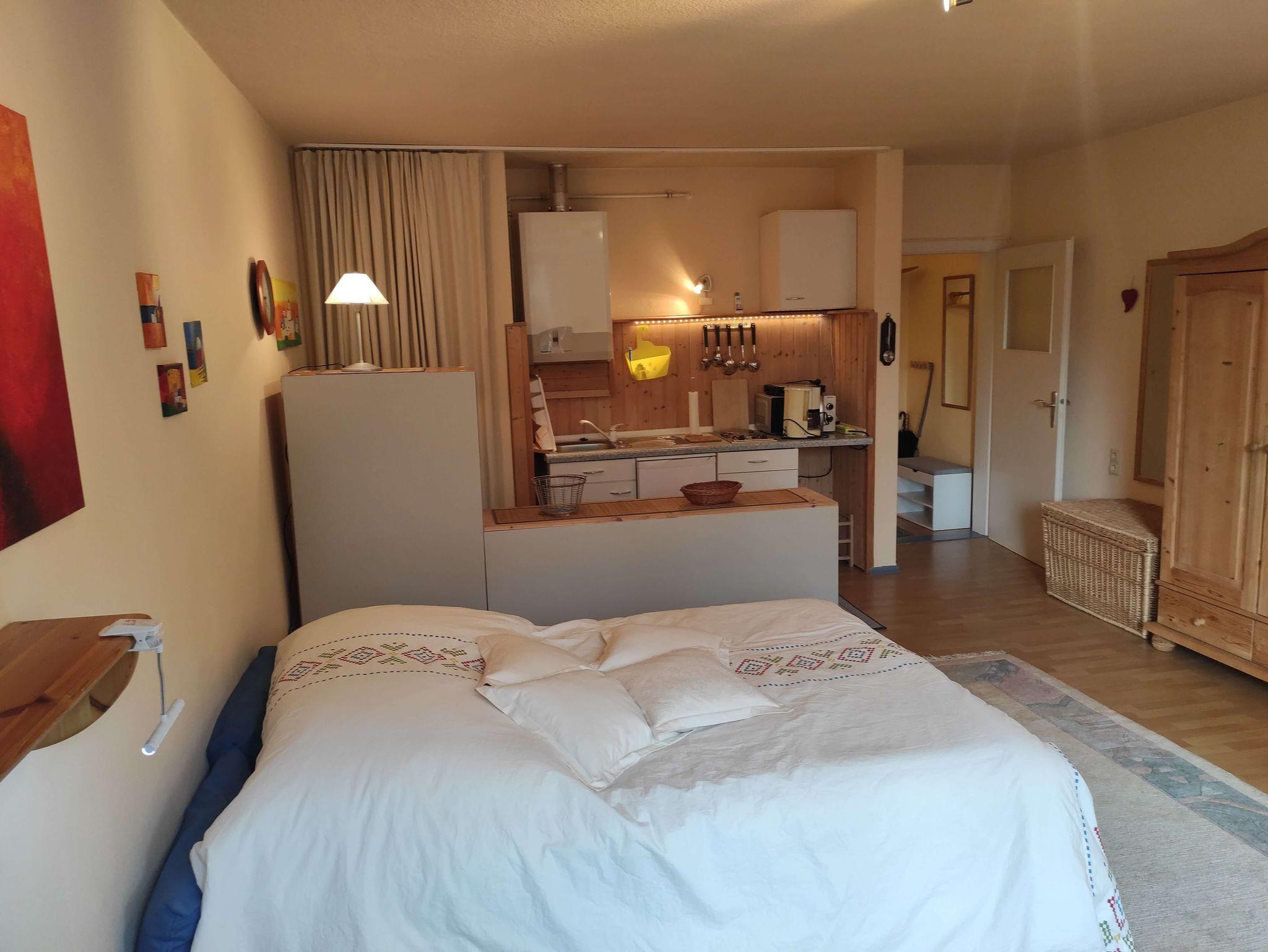 Das gemütliche Einzimmer-Nichtraucher-Appartement ist für 2 Personen mit einem Doppelbett (Matratze 140x200 cm), 2 Cocktailsesseln, Kleiderschrank, Sekretär und Esstisch mit 4 Stühlen eingerichtet.