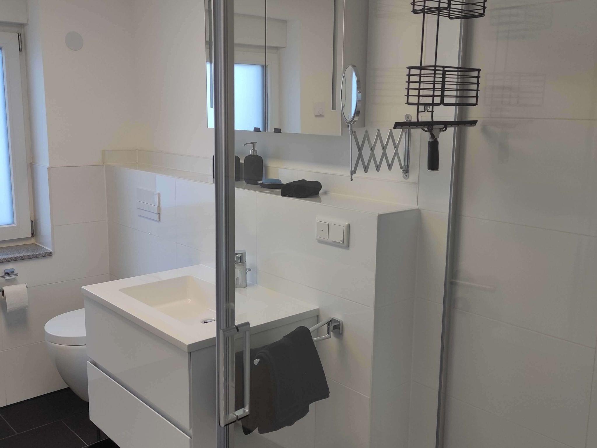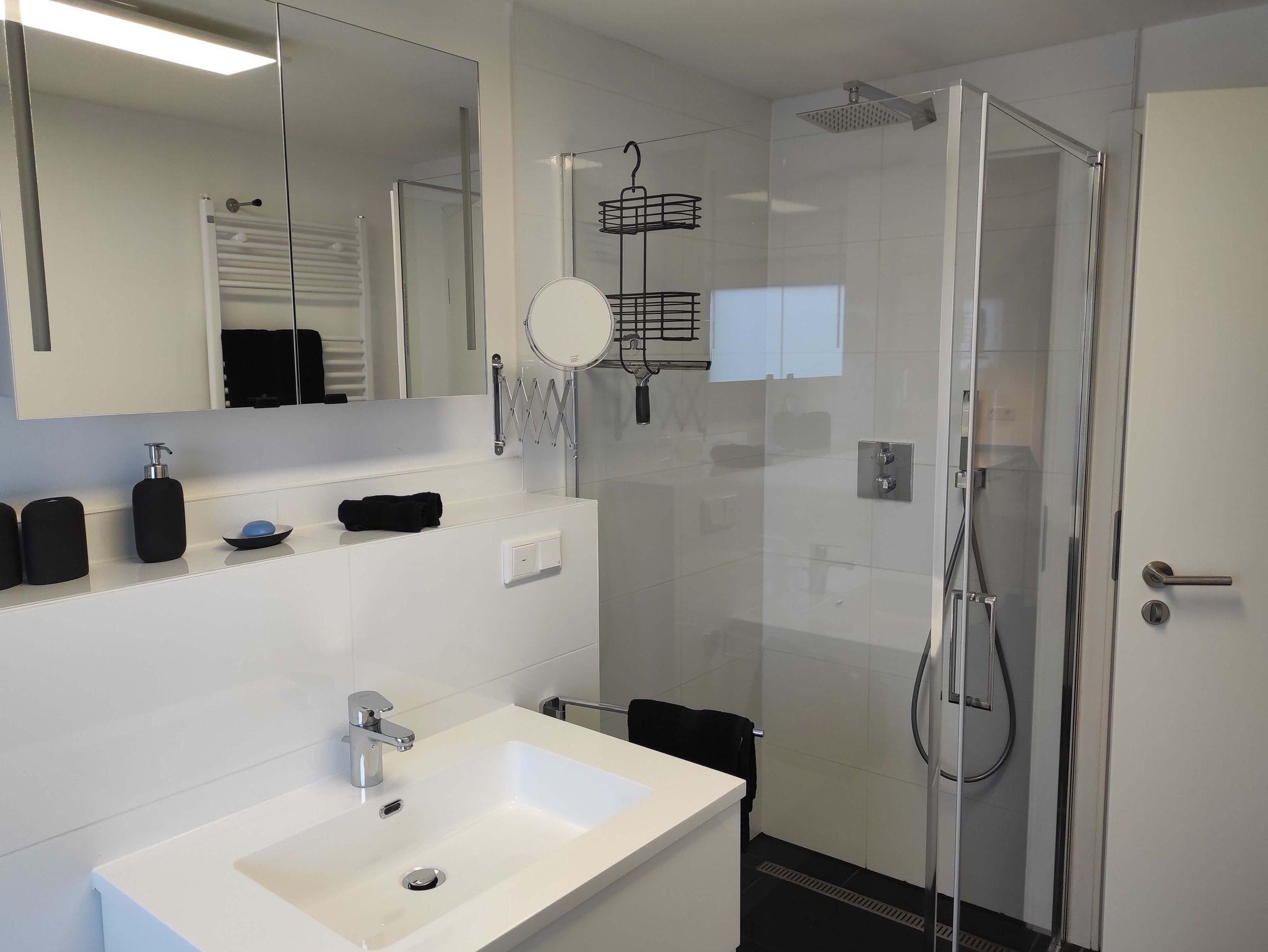 Im Bad befindet sich eine ebenerdige Dusche, ein Vergrößerungsspiegel und ein Fön.