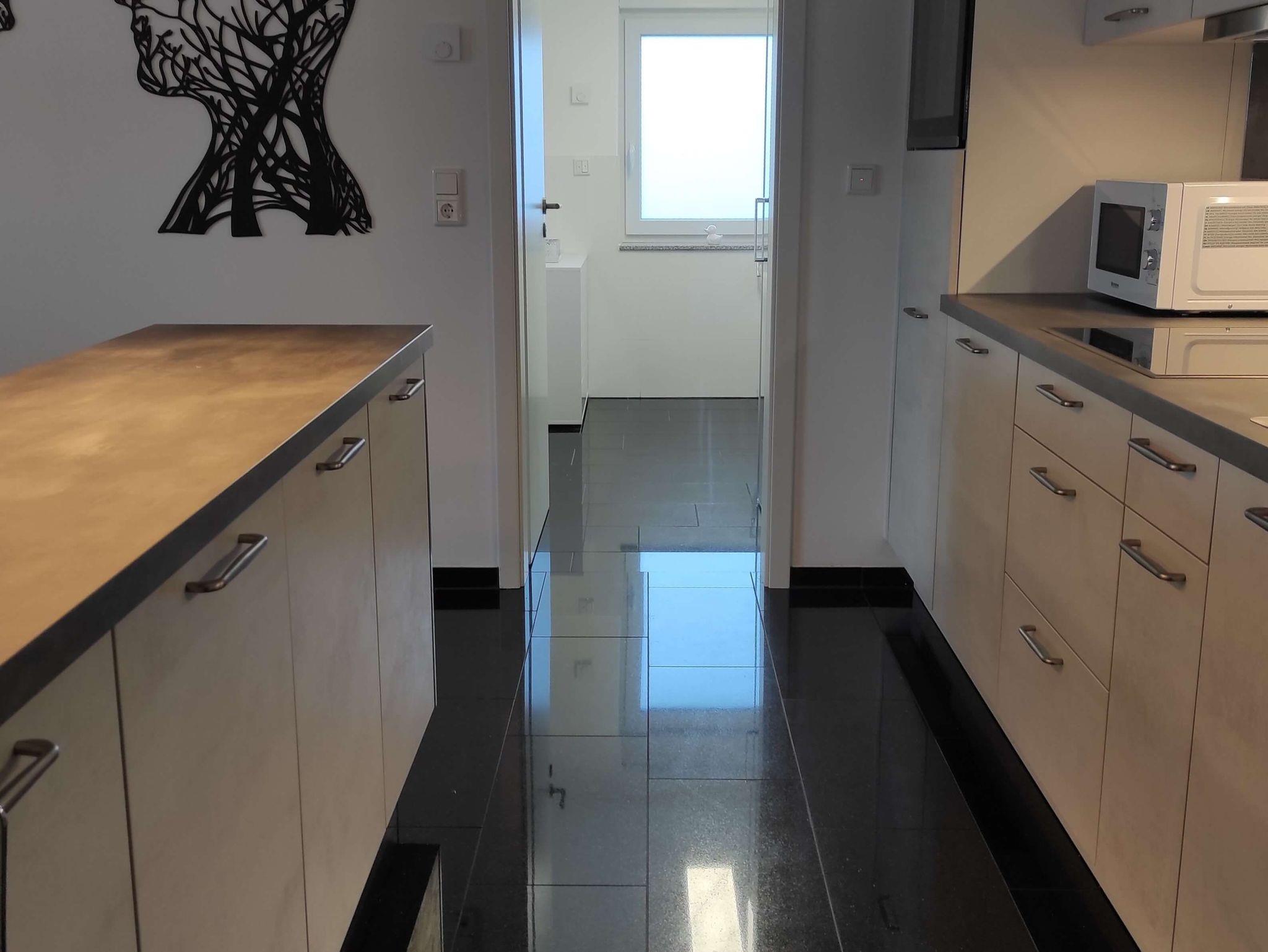 Die offene, bestens ausgestattete Küche erreichen Sie über 2 Treppenstufen. Zur hochwertigen Aussstattung gehören u. a. eine Kaffeemaschine, eine Tschibo Caffissimo, eine Mikrowelle, ein Induktionskochfeld, ein Ofen, eine Waschmaschine, ein Wasserkocher, ein Toaster etc...