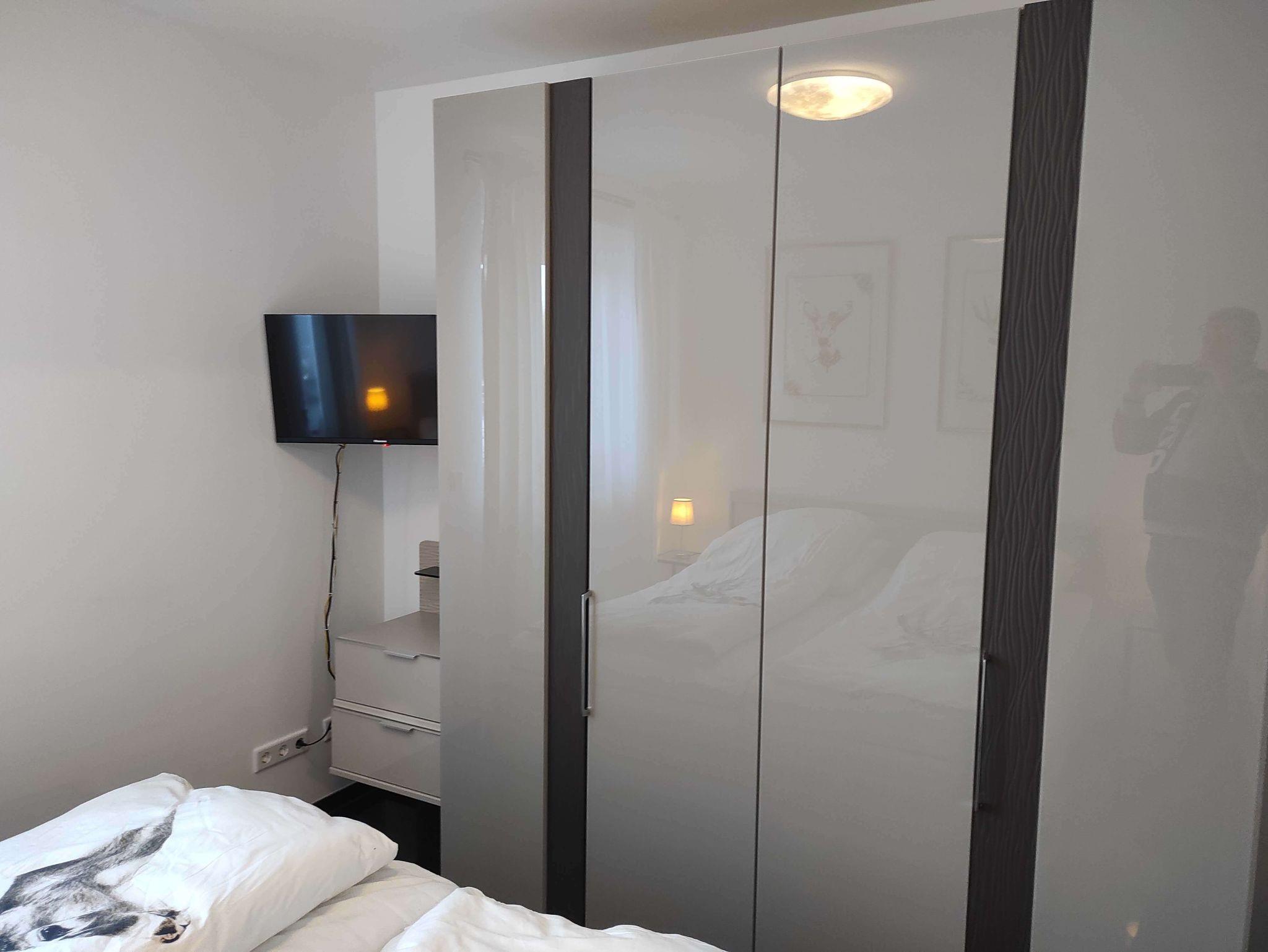 Im Schlafzimmer steht ein 180 x 200 cm Doppelbett, sowie ein 200 cm breiter Kleiderschrank, in dem sich problemlos die mitgebrachte Kleidung unterbringen lässt. Ein weiterer 32 Zoll großer fernseher runden die Einrichtung des Schlafzimmers ab.