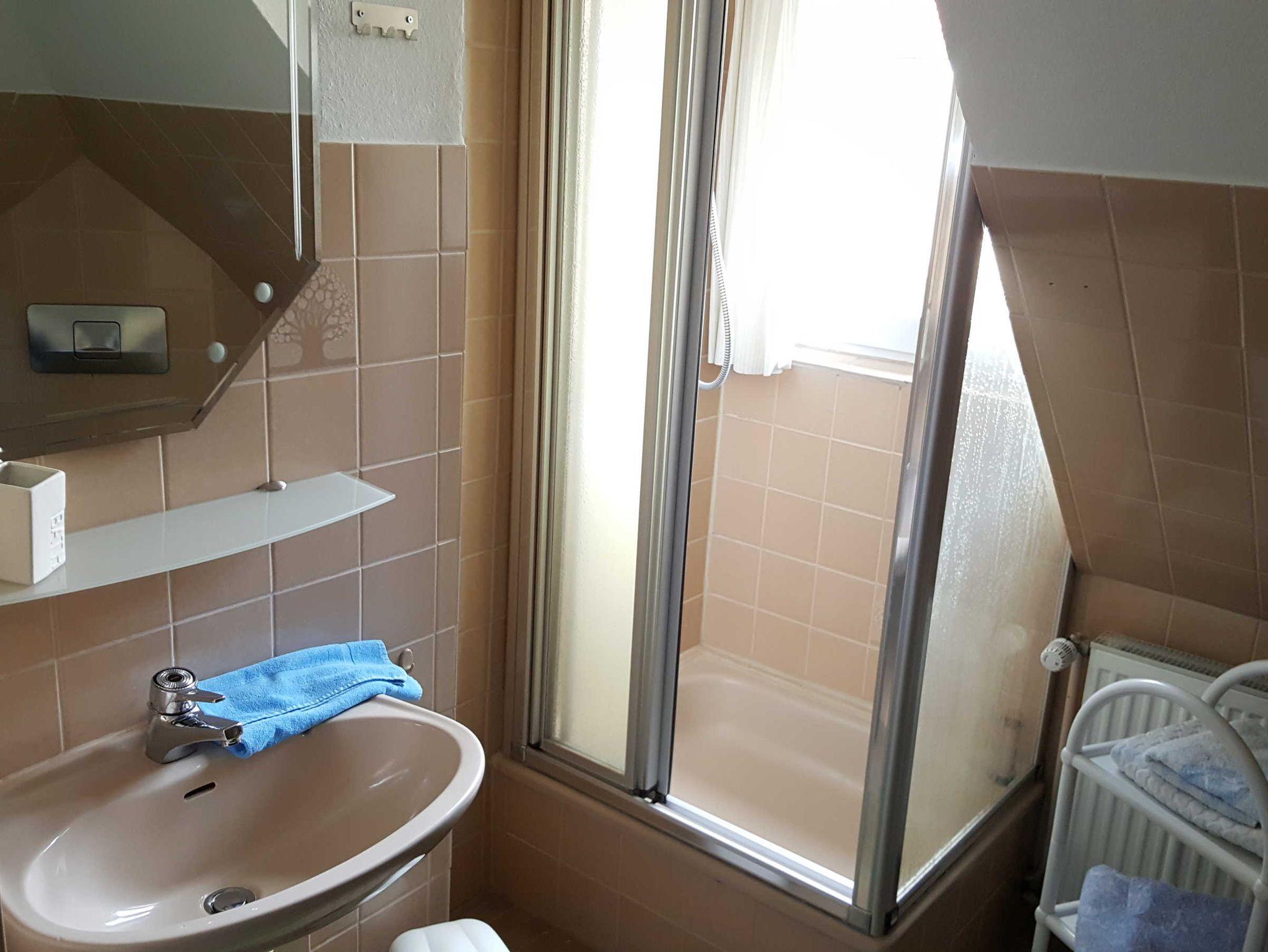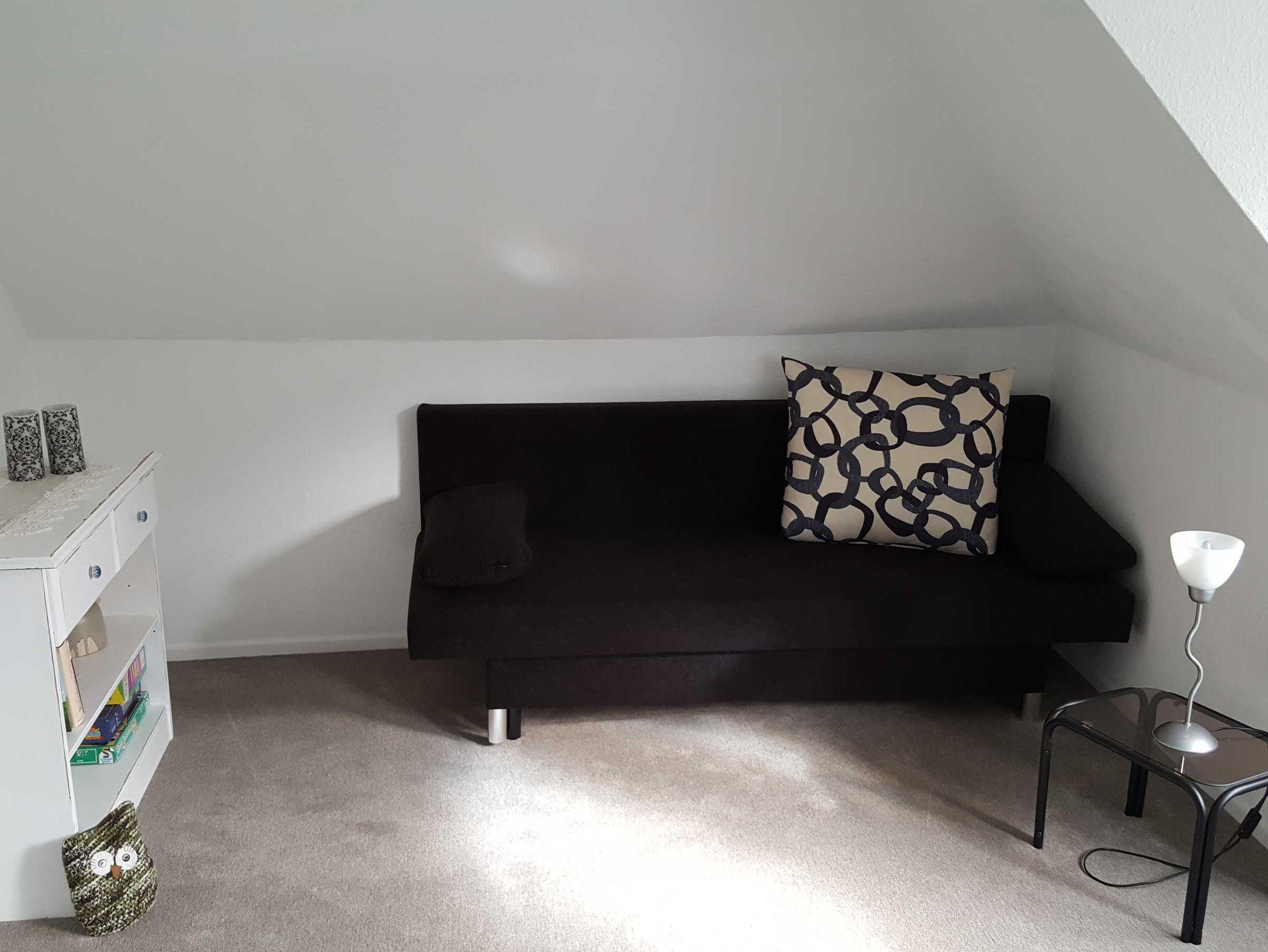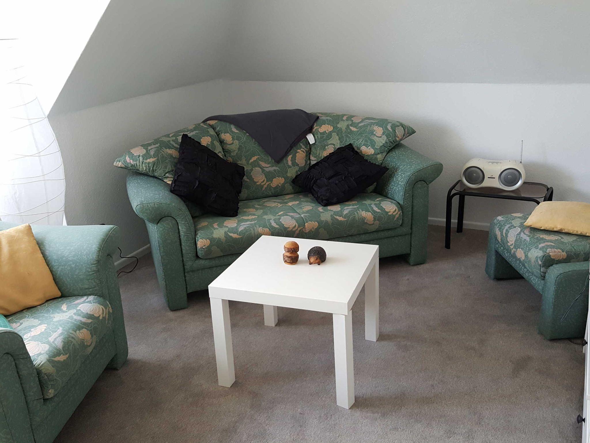Die Wohnung teilt sich auf in ein gemütliches Wohnzimmer mit Dachschrägen, Schlafzimmer mit großem Doppelbett, Küche mit Dachschrägen, kleinem Duschbad und kleinem Flur. Die Wohnung ist hell, freundlich und modern eingerichtet. Im Wohnzimmer befindet sich eine weitere Schlafmöglichkeit durch ein gemütliches Schlafsofa. Die Wohnung liegt im Dachgeschoss und ist über 2 Treppen zu erreichen. Die Ferienwohnung ist eine Nichtraucherwohnung. Das Wohnzimmer ist mit einem Teppich ausgestattet, die restlichen Zimmer haben Laminatfußboden. Im Garten finden Sie Sitzgelegenheiten zur Nutzung.